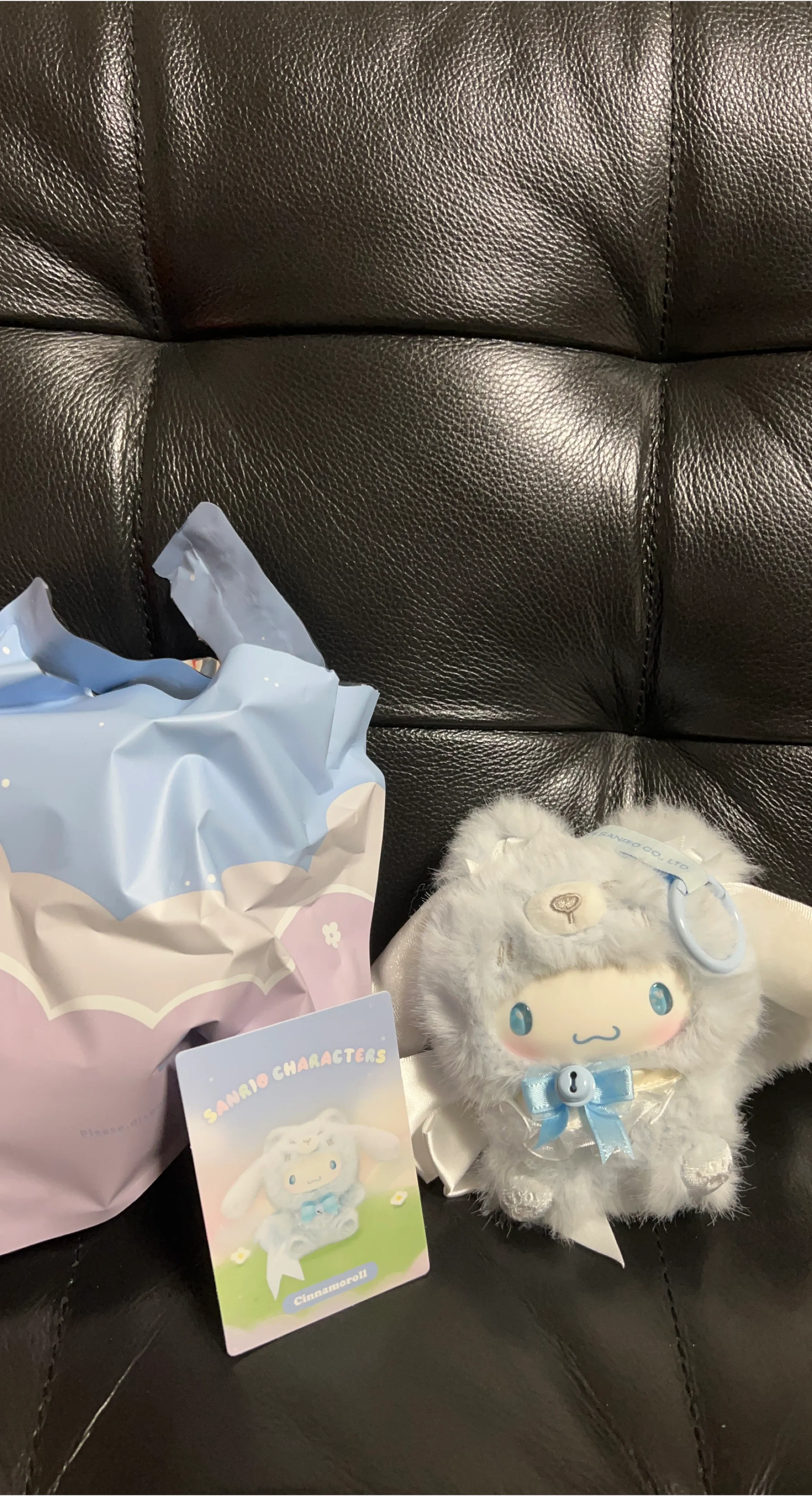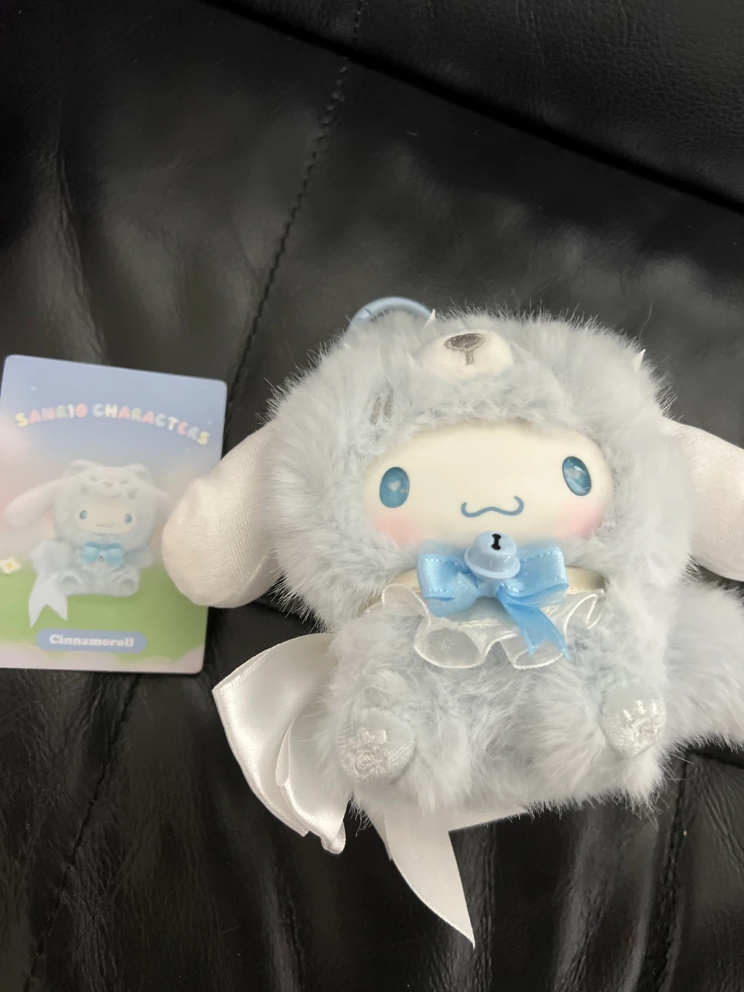 Cute Cinnamoroll plush keychain from Sanrio Characters. It's fuzzy and comes with a blue bow. Perfect for adding a touch of charm to your bag or backpack!