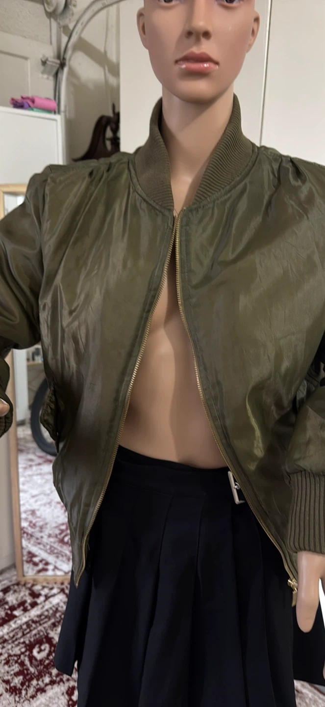 Olive green bomber jacket with a front zipper closure and ribbed cuffs and hem. It has a smooth satin-like exterior and an orange interior lining. This jacket is a stylish outerwear piece.