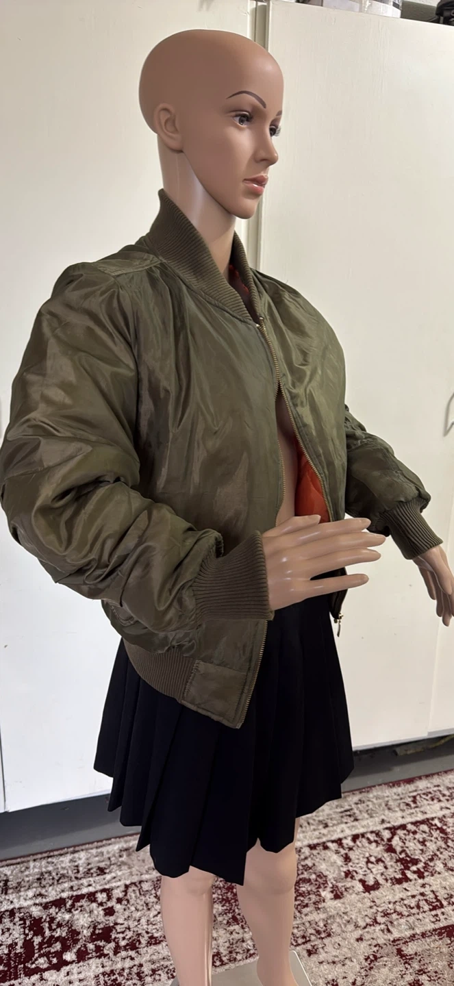 Olive green bomber jacket with a front zipper closure and ribbed cuffs and hem. It has a smooth satin-like exterior and an orange interior lining. This jacket is a stylish outerwear piece.