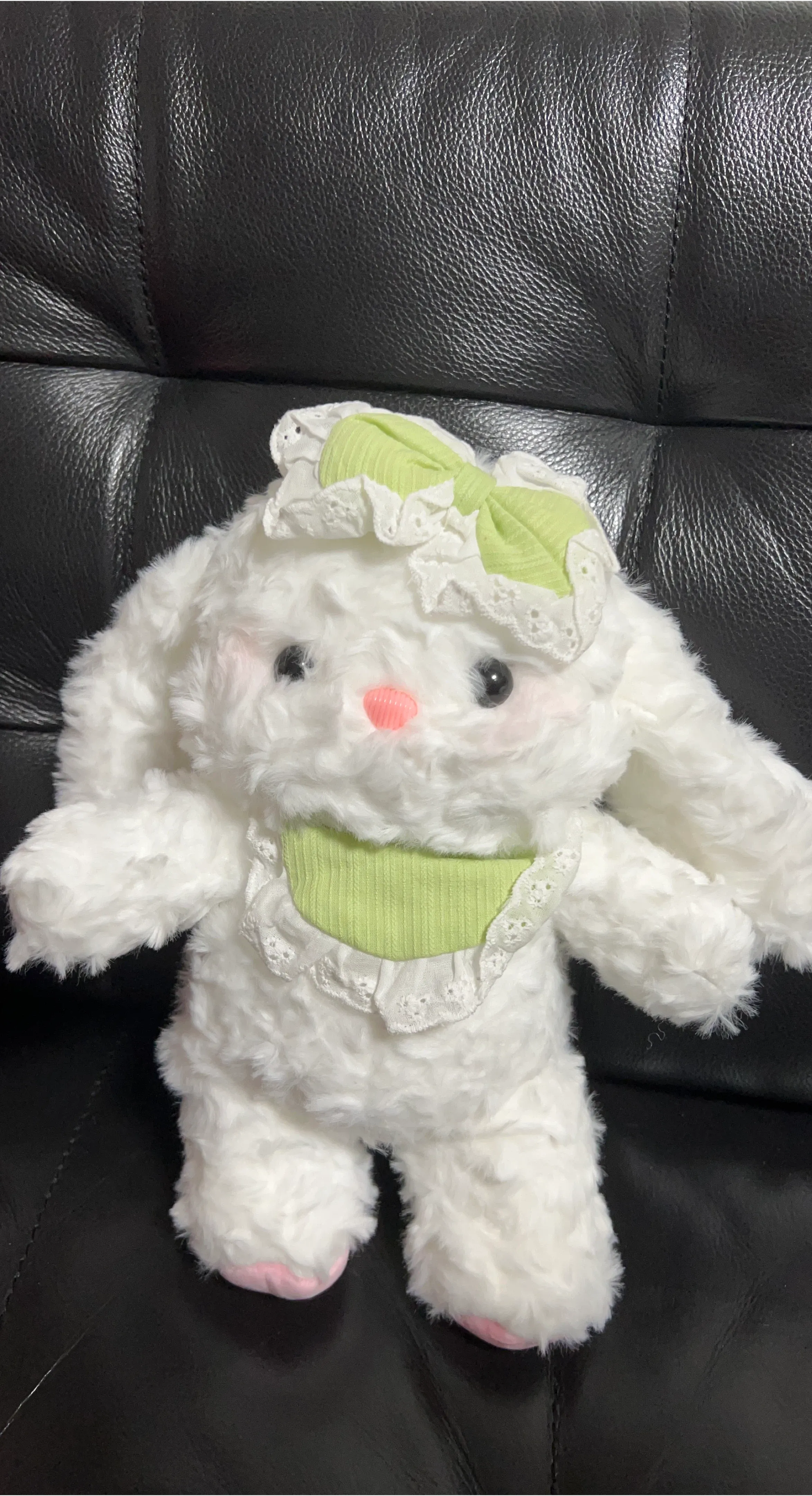 Soft and cuddly white bunny plush toy. It features a green bow on its head and a matching green bib with lace trim. Its feet have a pink accent.