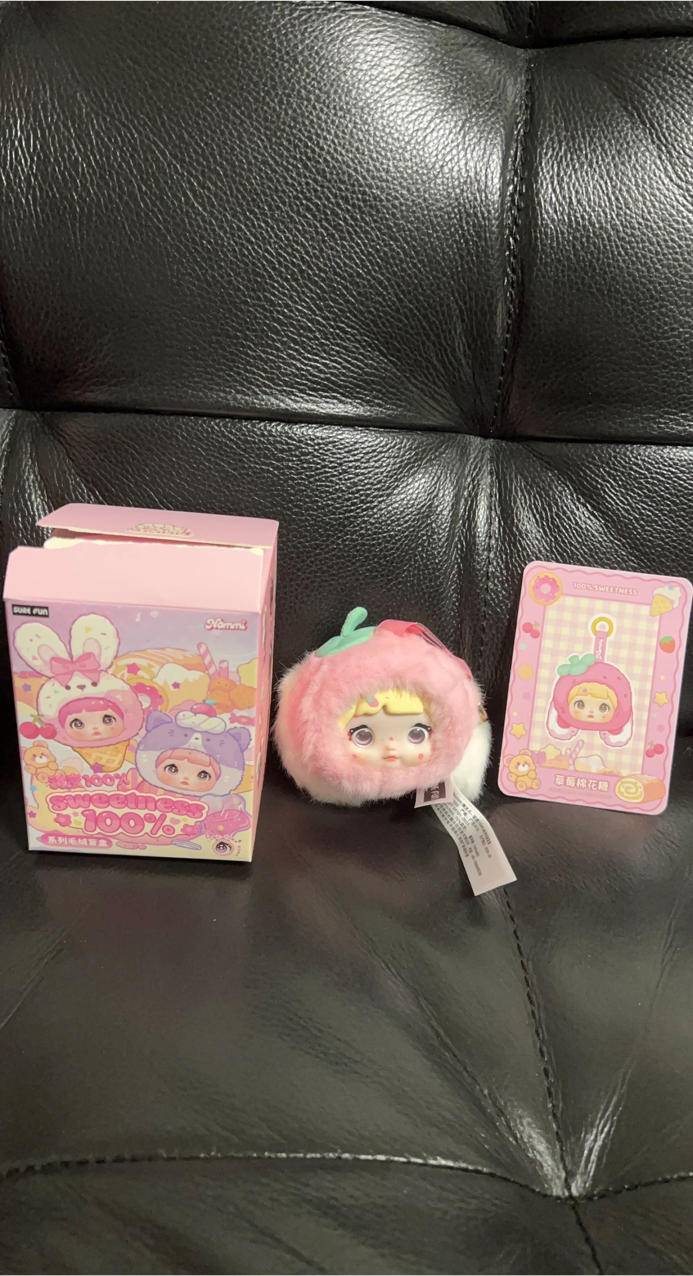 This is a Nommi 100% Sweetness plush toy, featuring a strawberry cotton candy design. It's a fluffy and adorable collectible item. The plush comes with its original packaging and a collectible card.