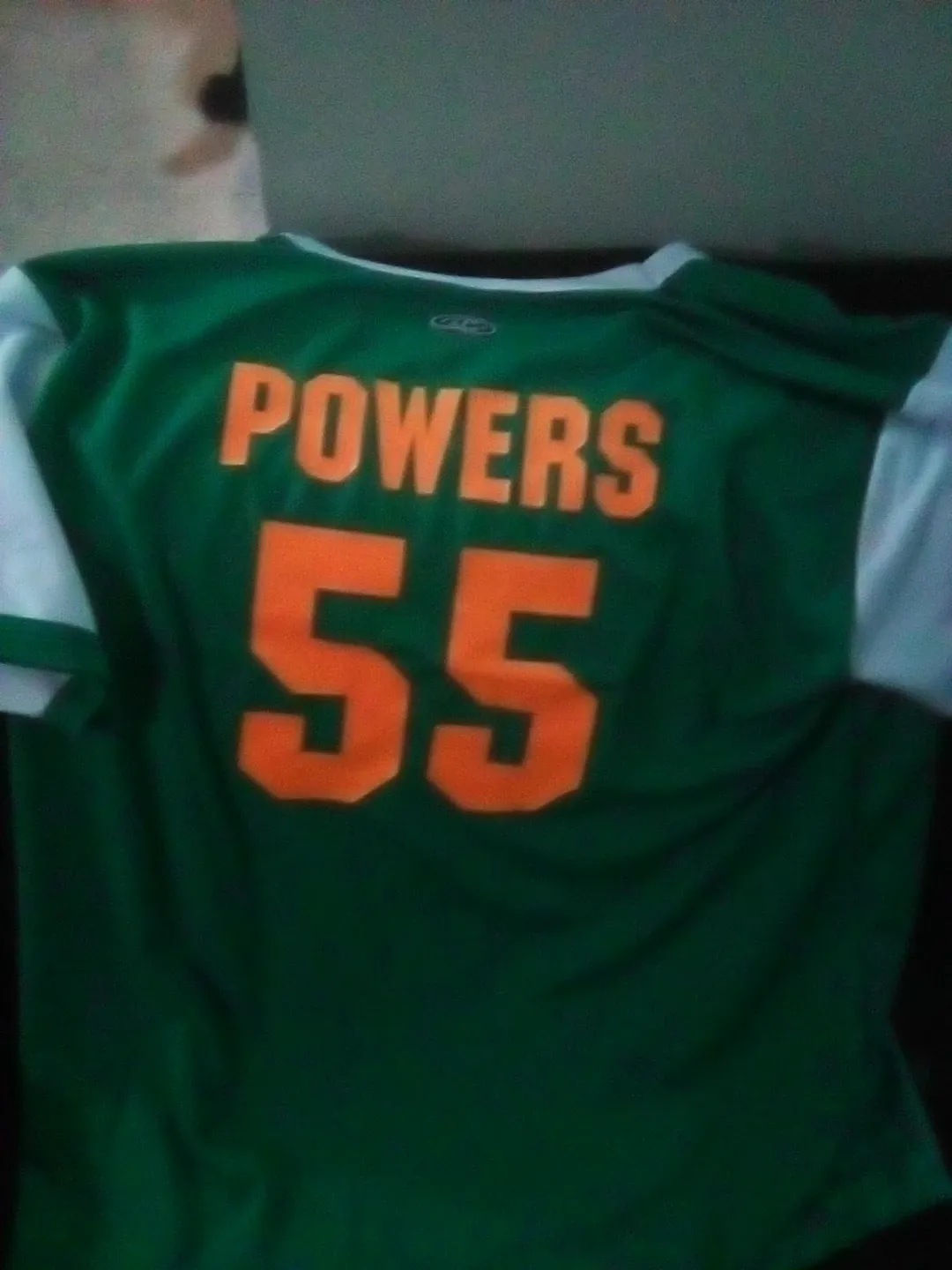 This is a green jersey with orange lettering that says POWERS and the number 55. It's a sports jersey. The material appears to be polyester.