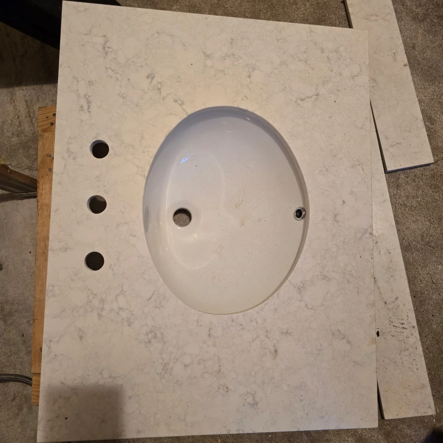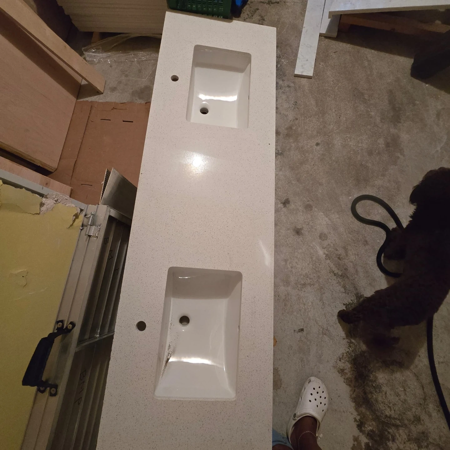 This is a double vanity countertop with two white undermount sinks. The countertop material appears to be quartz and features a white and grey marble-like pattern. It has holes pre-drilled for faucets. Both Sink for $900 Firm.Lets go....