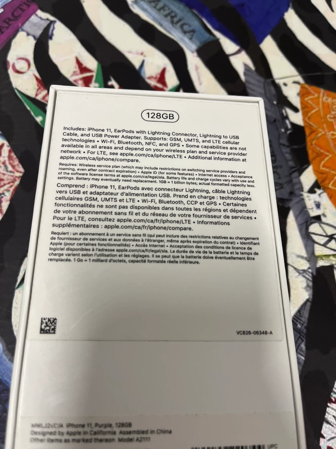 Empty BoxApple iPhone 11 in purple with 128GB storage. It includes a Lightning Connector, Lightning to USB Cable, and USB Power Adapter. Supports Wi-Fi, Bluetooth, NFC, and GPS.