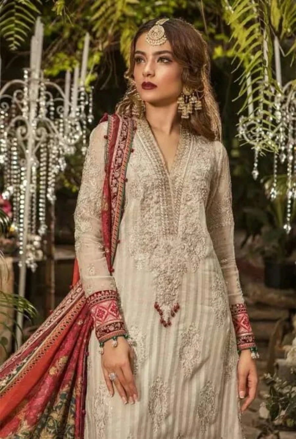 This elegant suit features intricate embroidery on the neckline and sleeves. It comes with a beautifully printed dupatta. The material is lightweight and breathable, perfect for warmer weather.