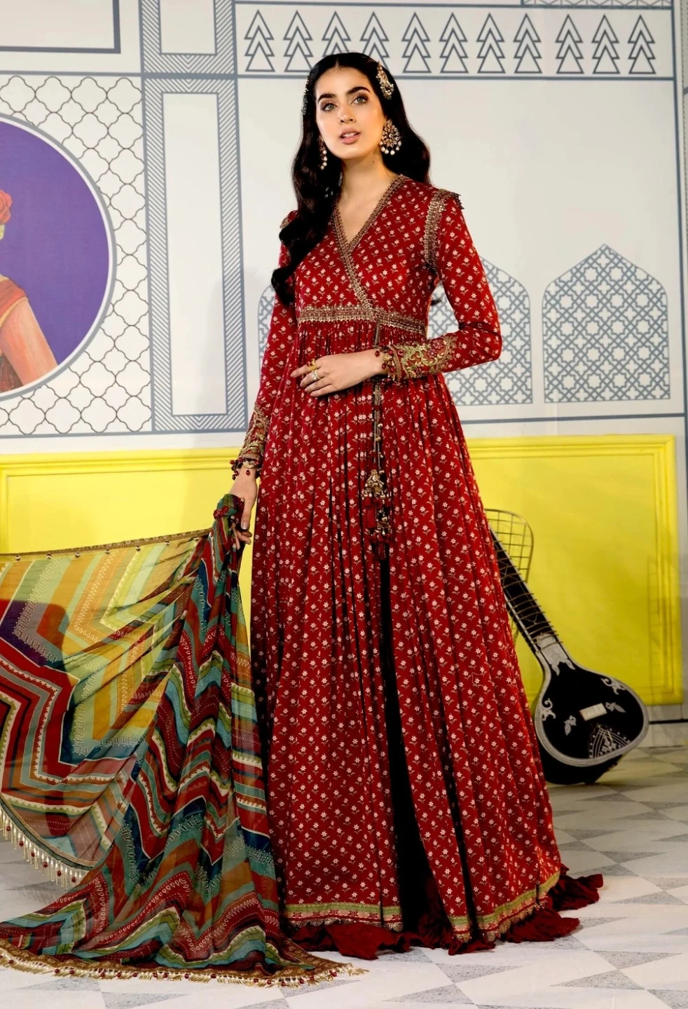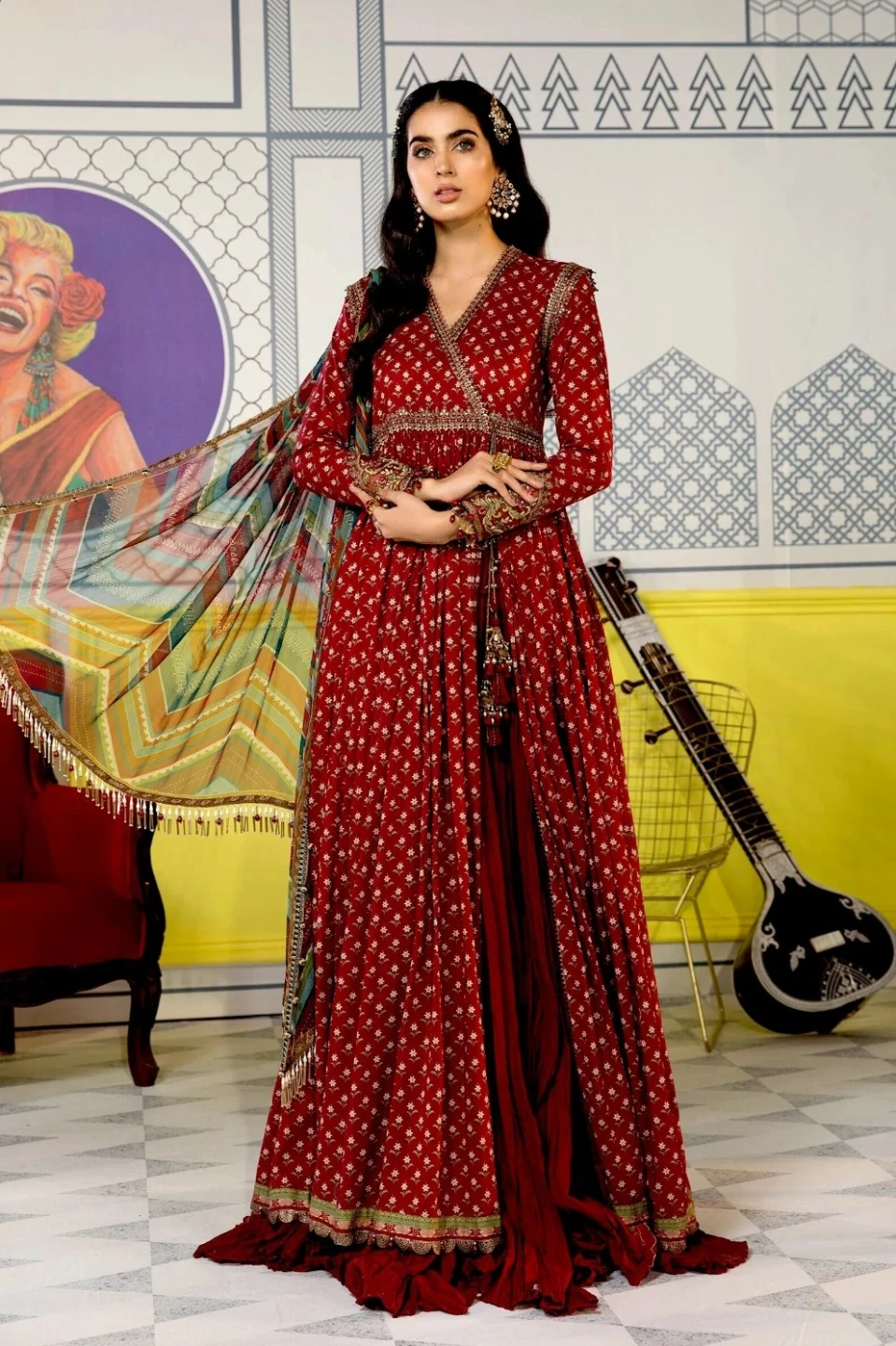This stunning red Anarkali dress features a beautiful all-over print and intricate detailing. It comes with a matching colourful dupatta. Perfect for special occasions or festive events!