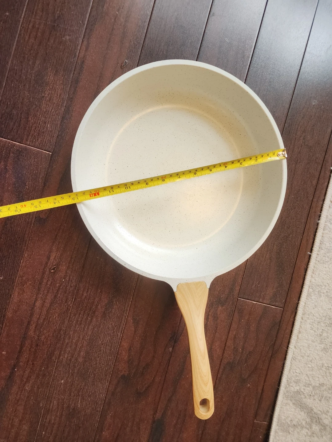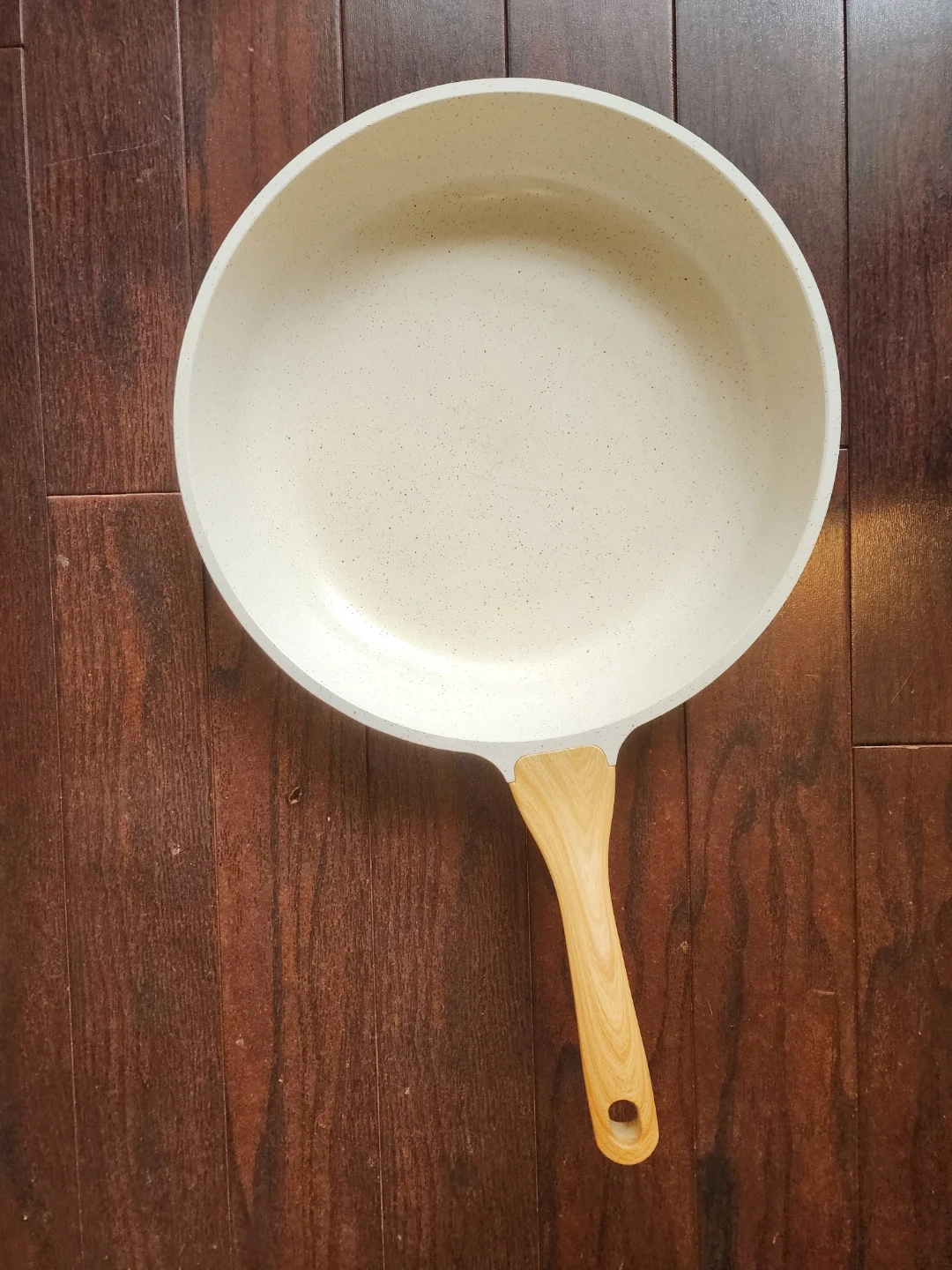 Large frying pan with a speckled cream interior and a light wood handle. It measures approximately 11 inches in diameter and is deep. Mild scratch in center as shown.