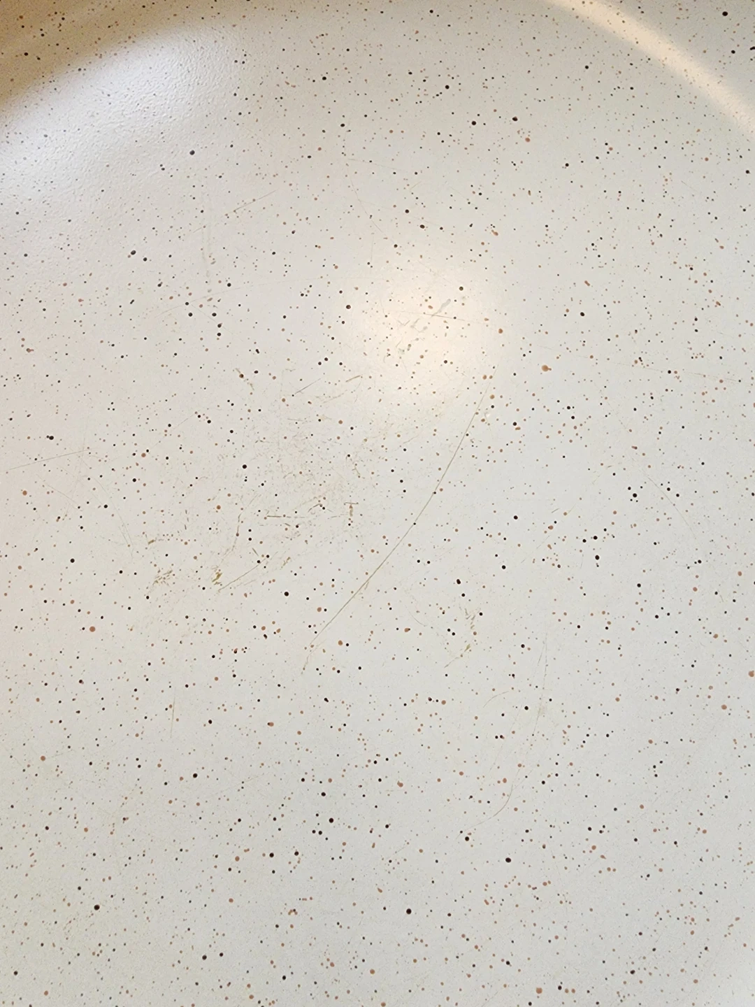 Large frying pan with a speckled cream interior and a light wood handle. It measures approximately 11 inches in diameter and is deep. Mild scratch in center as shown.