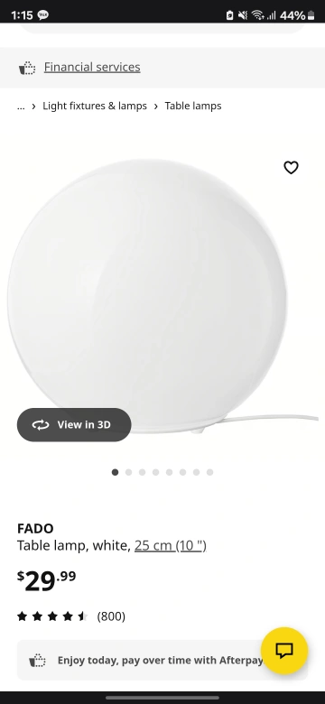 This is an IKEA FADO table lamp in white. It's 25 cm in diameter. The lamp provides a soft, ambient light.