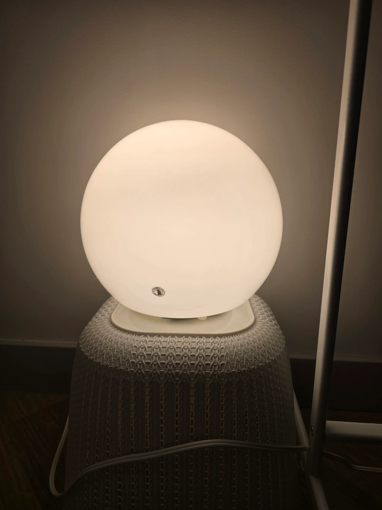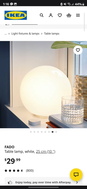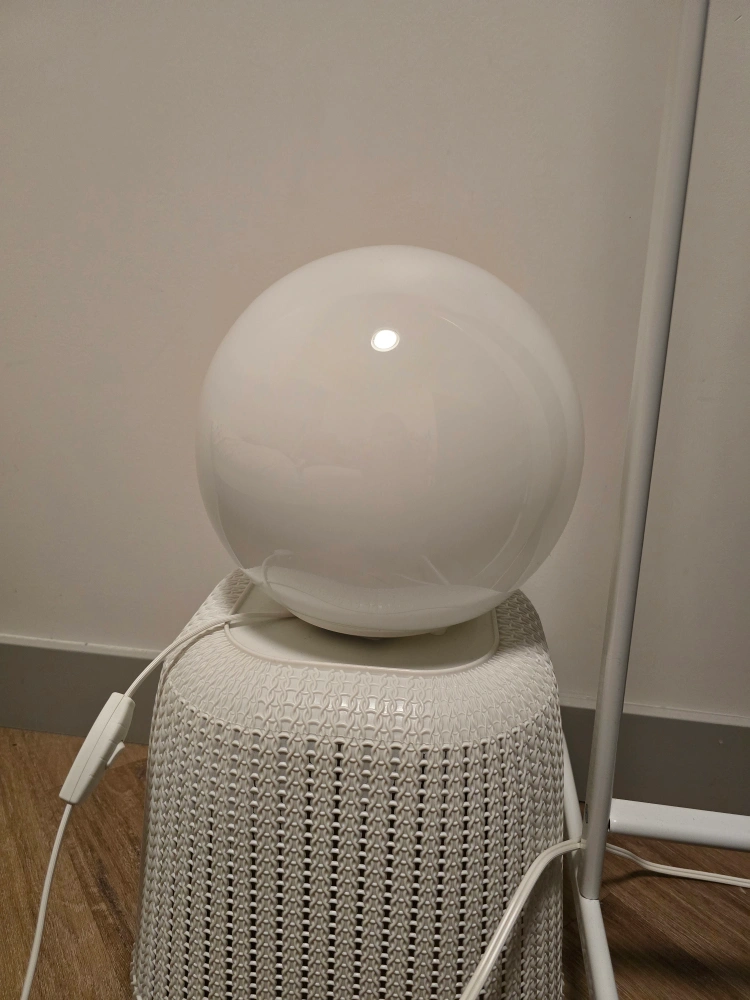 This is an IKEA FADO table lamp in white. It's 25 cm in diameter. The lamp provides a soft, ambient light.