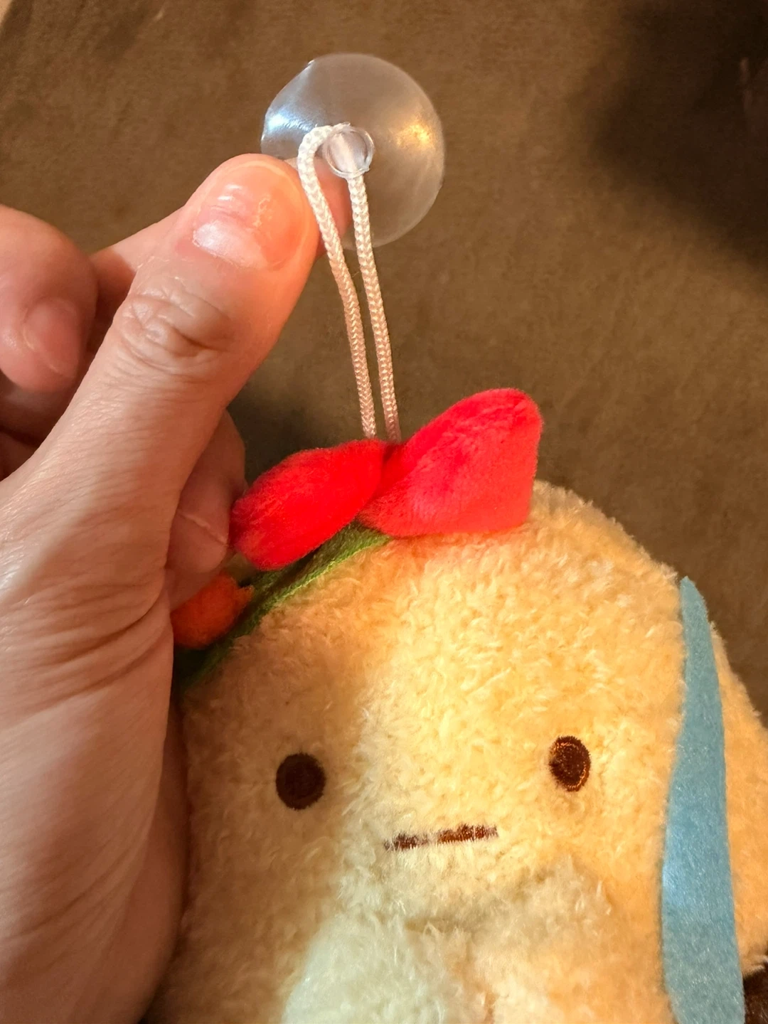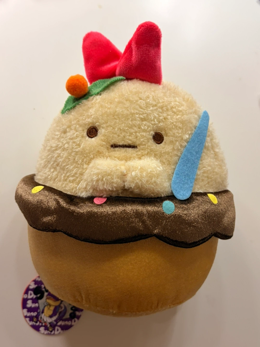 Super cute Sumikko Gurashi plush designed like a cupcake. It's soft and fuzzy with a red bow on top. Features a small string with a suction cup for hanging!
