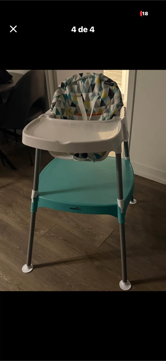 This is an Evenflo 4-in-1 high chair with a teal seat and a grey frame. It features a patterned seat cushion. It's designed for multiple stages of use as your child grows.