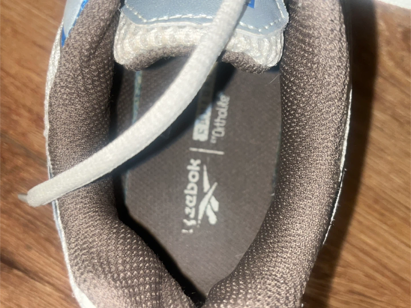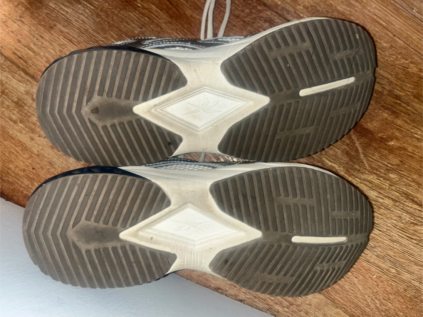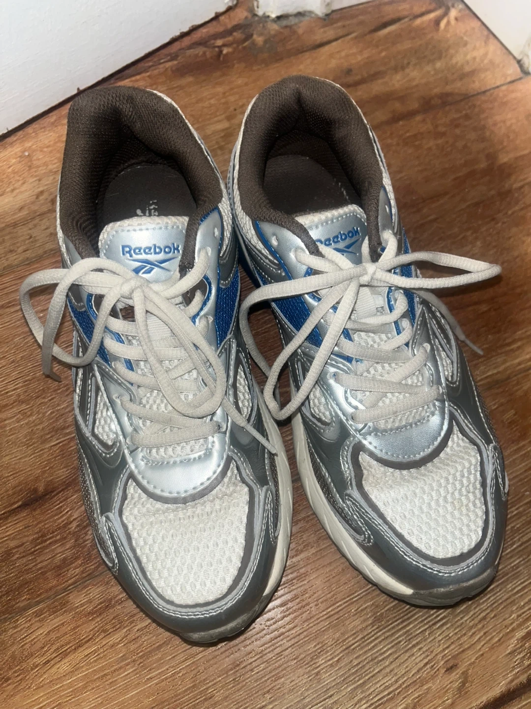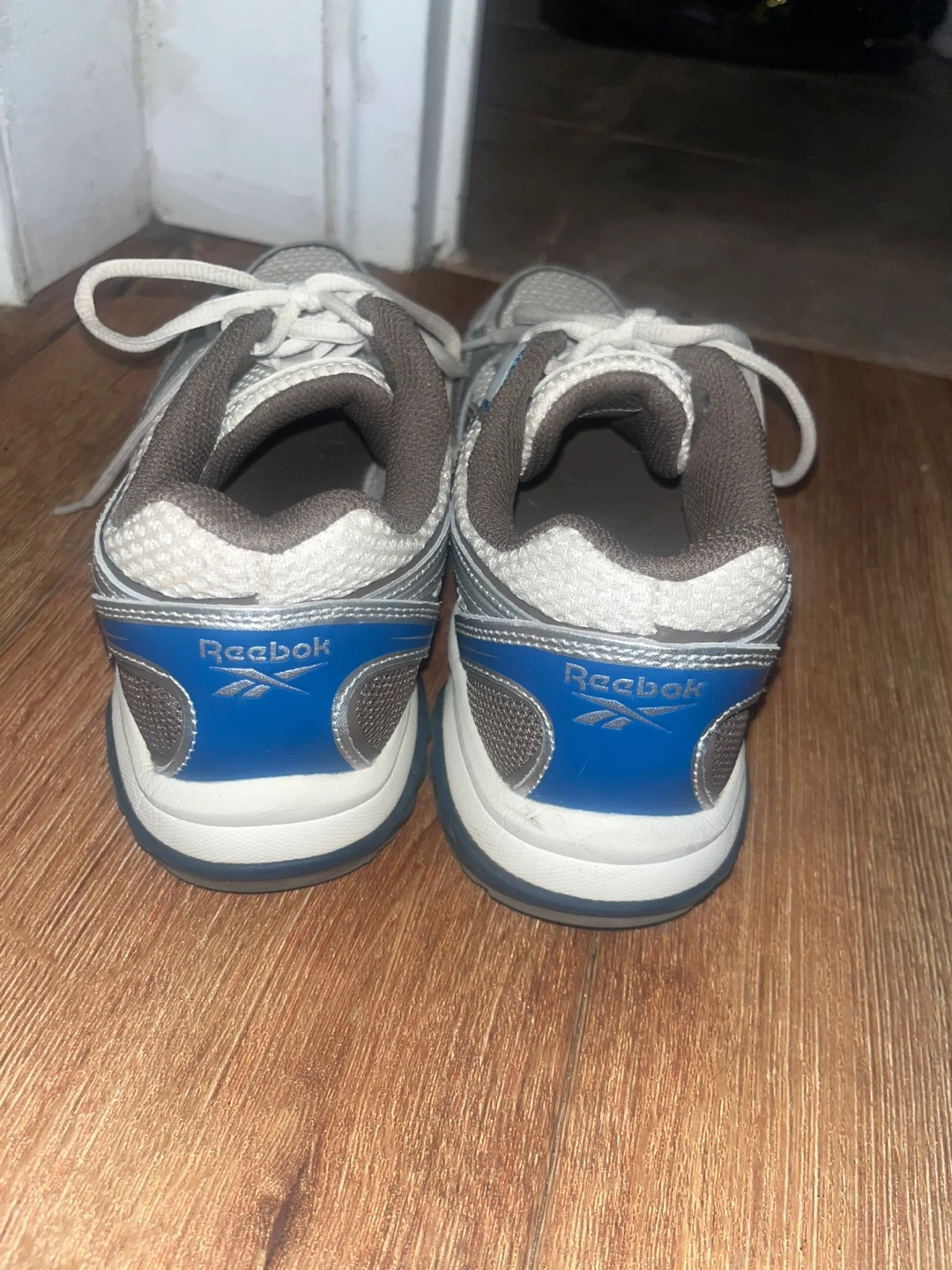 These Reebok running shoes are a size 10. They feature a silver, blue, and white design. Perfect for hitting the gym or going for a jog!