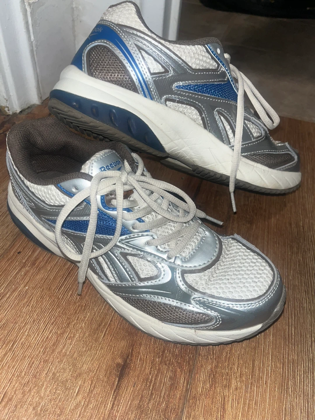 These Reebok running shoes are a size 10. They feature a silver, blue, and white design. Perfect for hitting the gym or going for a jog!