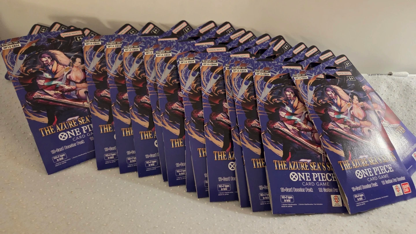 Selling OP-14-EB04 sleeved booster packs. Each pack contains 12 cards. English version, set OP14-EB04. These are the Azure Sea's Seven booster packs.