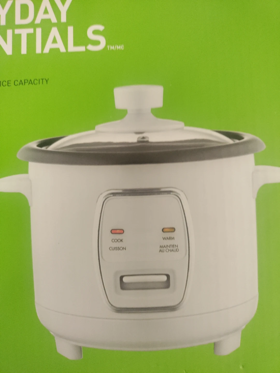This is an Everyday Essentials rice cooker. It has 'Cook' and 'Warm' indicator lights. Perfect for making rice at home!