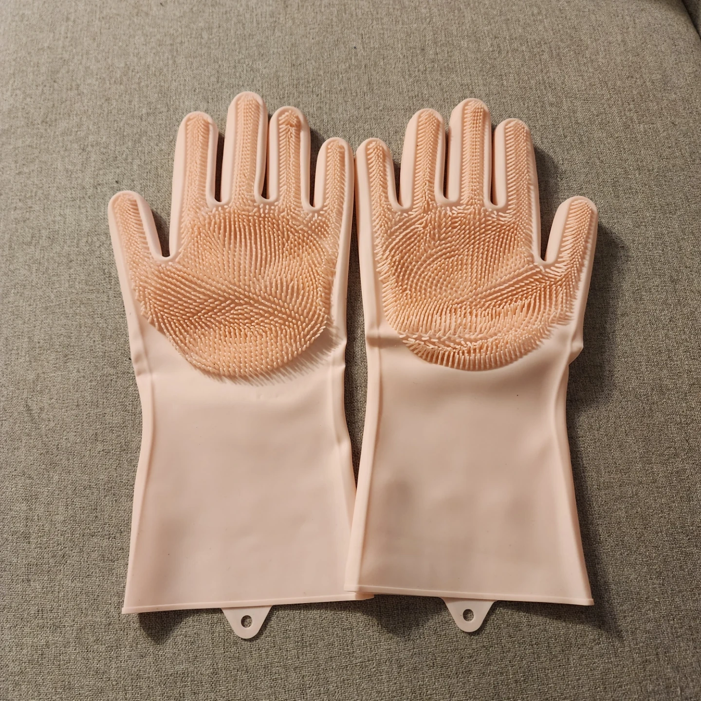 These washing gloves are made of silicone. They're designed with bristles on the palm side for scrubbing. Great for cleaning dishes and other household tasks!