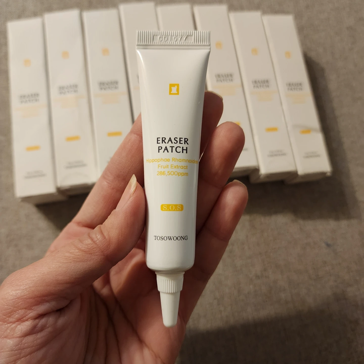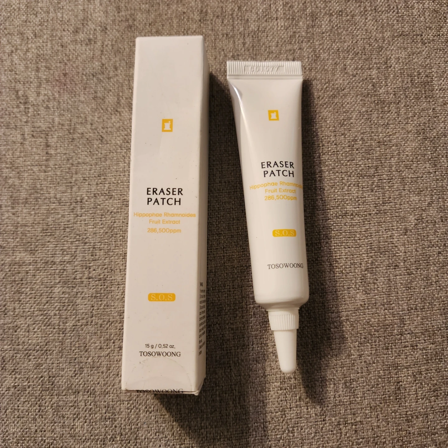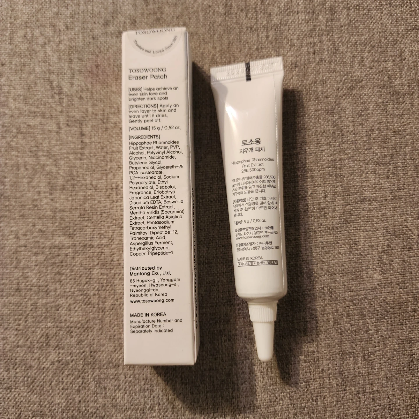 This is the TOSOWOONG Eraser Patch, containing Hippophae Rhamnoides Fruit Extract. It comes in a 15g tube. It's designed to help achieve brighter skin by diminishing dark spots.