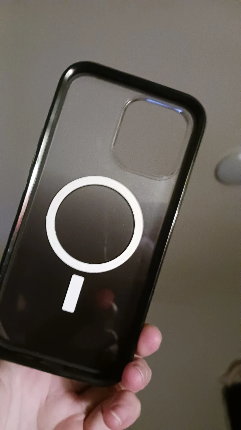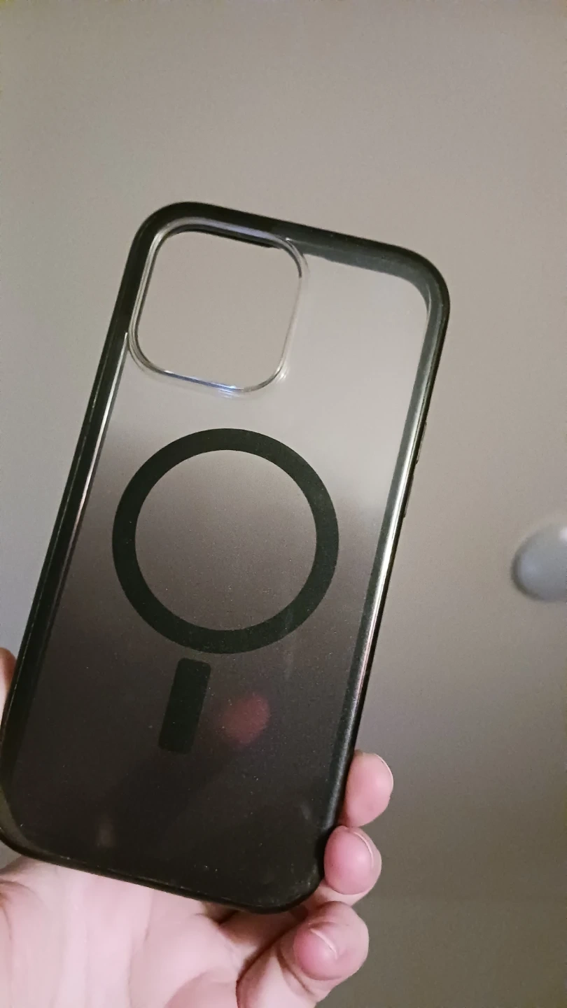 This is a MagSafe compatible iPhone case made by Otterbox . It's a clear case with a black gradient effect. It's designed for iPhone Pro Max model 11 - 16 with a camera cutout.