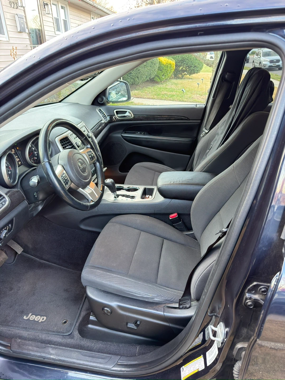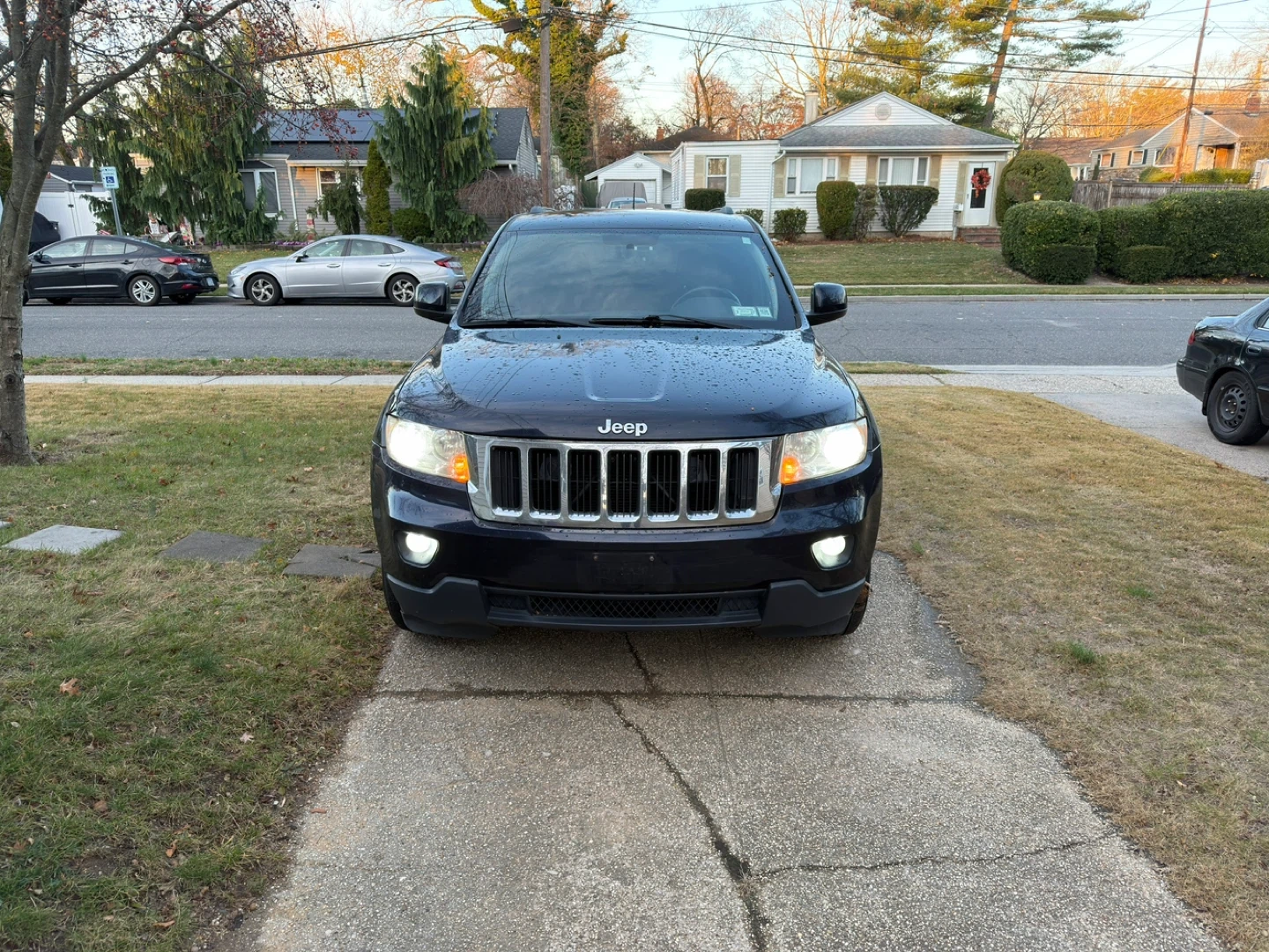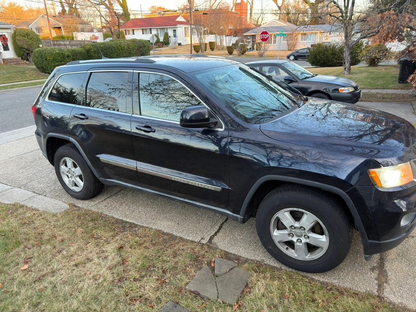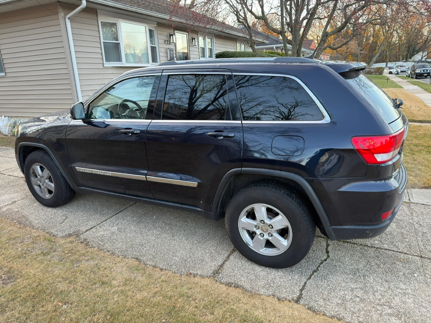 Dark navy blue Jeep Grand Cherokee Laredo. This 4x4 SUV has cloth interior and alloy wheels with low miles. It's a reliable vehicle for various terrains.