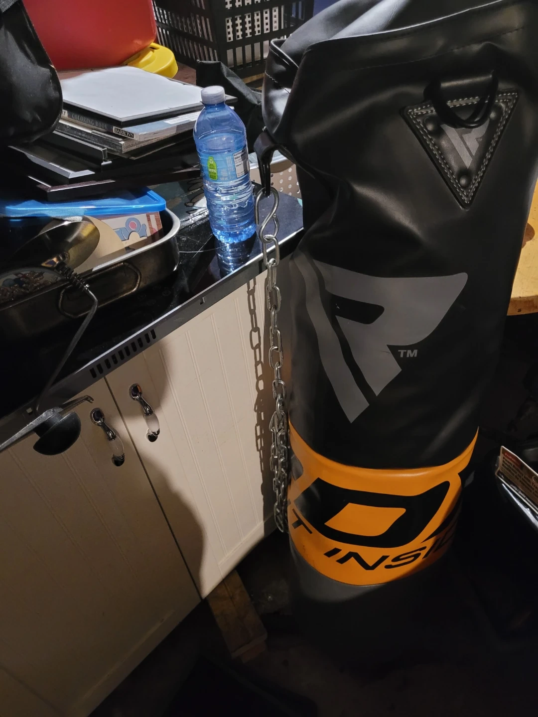 This is an Everlast punching bag. It's black with an orange band and a grey logo. Includes a heavy-duty chain for hanging. Hanging 5 feet tall