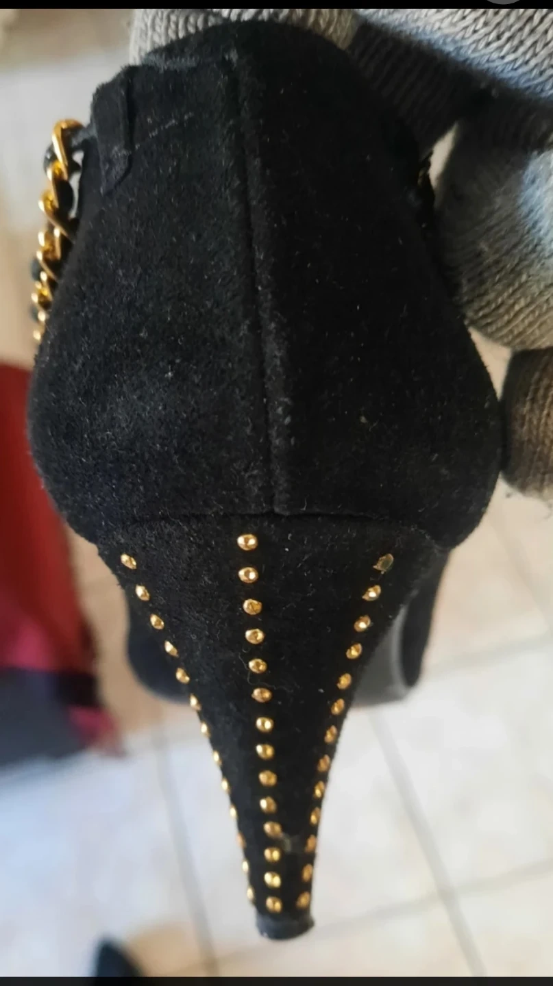 A pair of black Ravel heels with gold chain detail and gold stud embellishments. Also includes two pairs of navy blue velour slippers. Some wear/tear visible on the slippers. Size 7.5/8