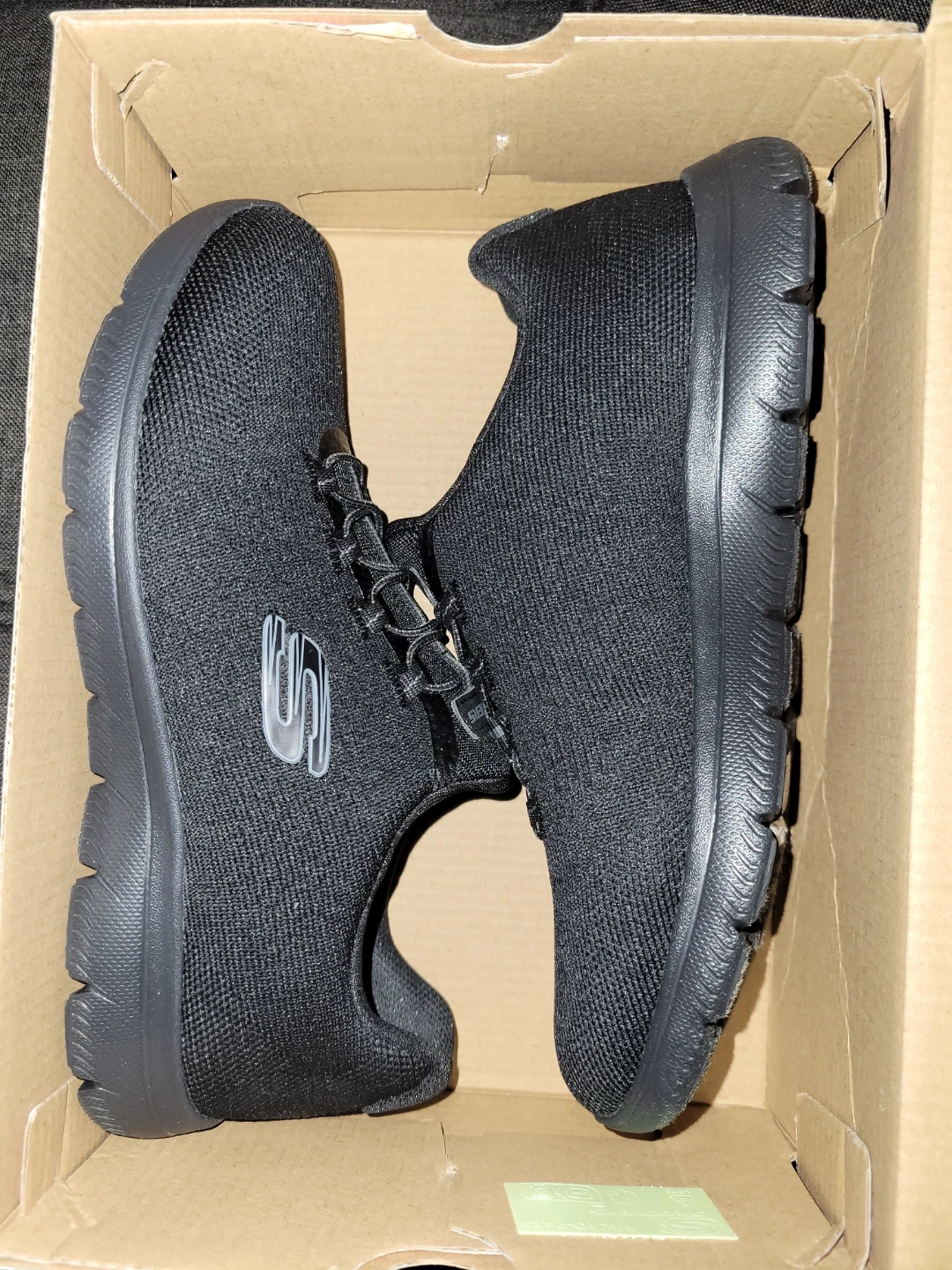 Black Skechers women's sneakers. These comfortable shoes feature a breathable mesh upper and a flexible sole. They're perfect for everyday wear and light activity.
