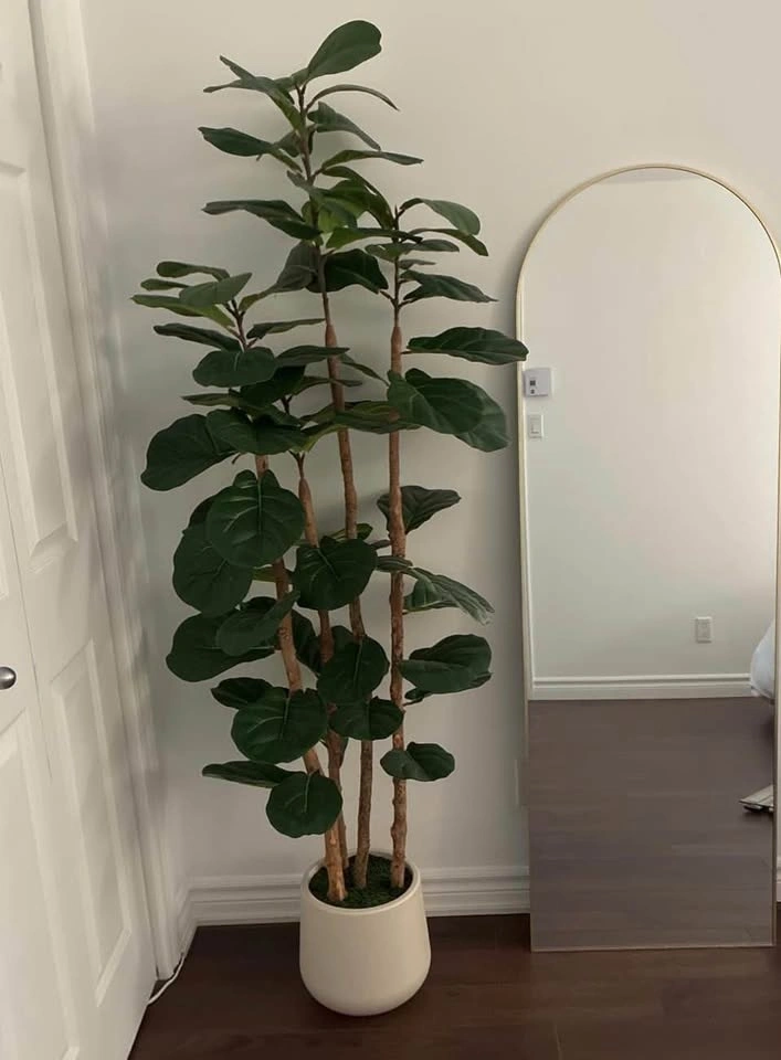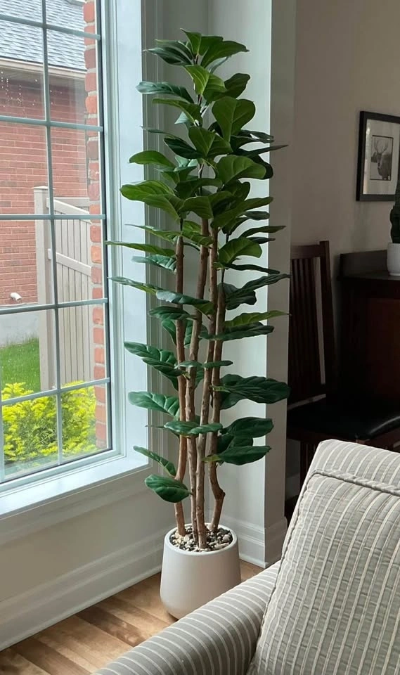 Artificial fiddle leaf fig tree with white planter. The 3 trunks of the ficus tree are made of natural wood poles, giving it a lifelike appearance with realistic texture and look. Pick up near Salem and Taunton.