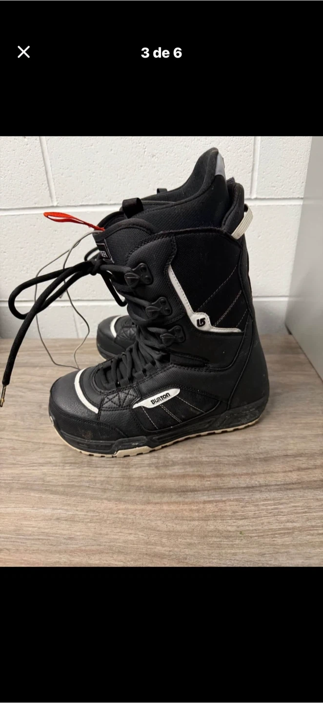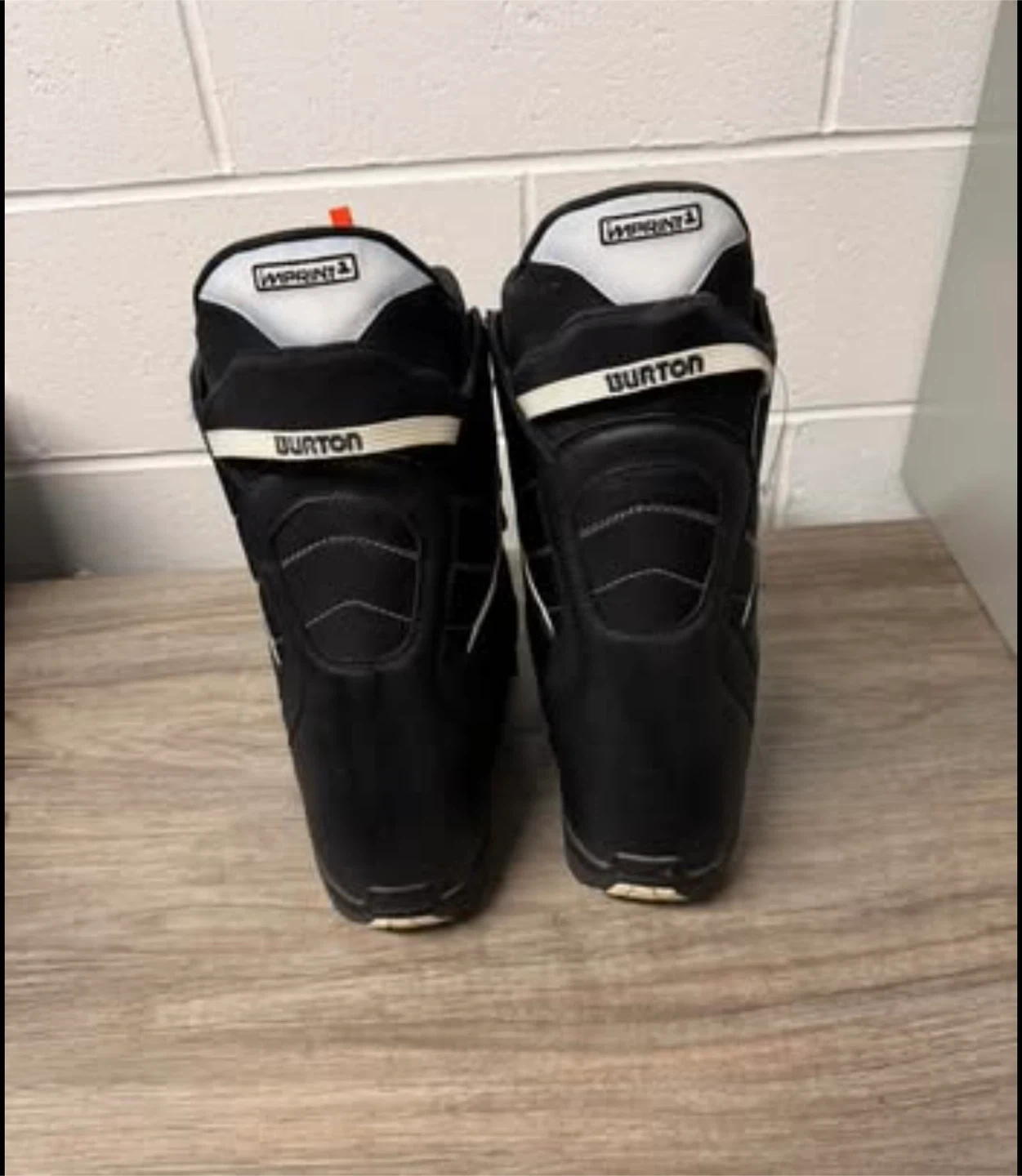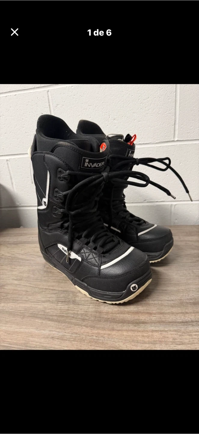 Black Burton Invader snowboard boots. Men's US size 9. Durable construction for riding. These boots offer a secure fit for your snowboard adventures!