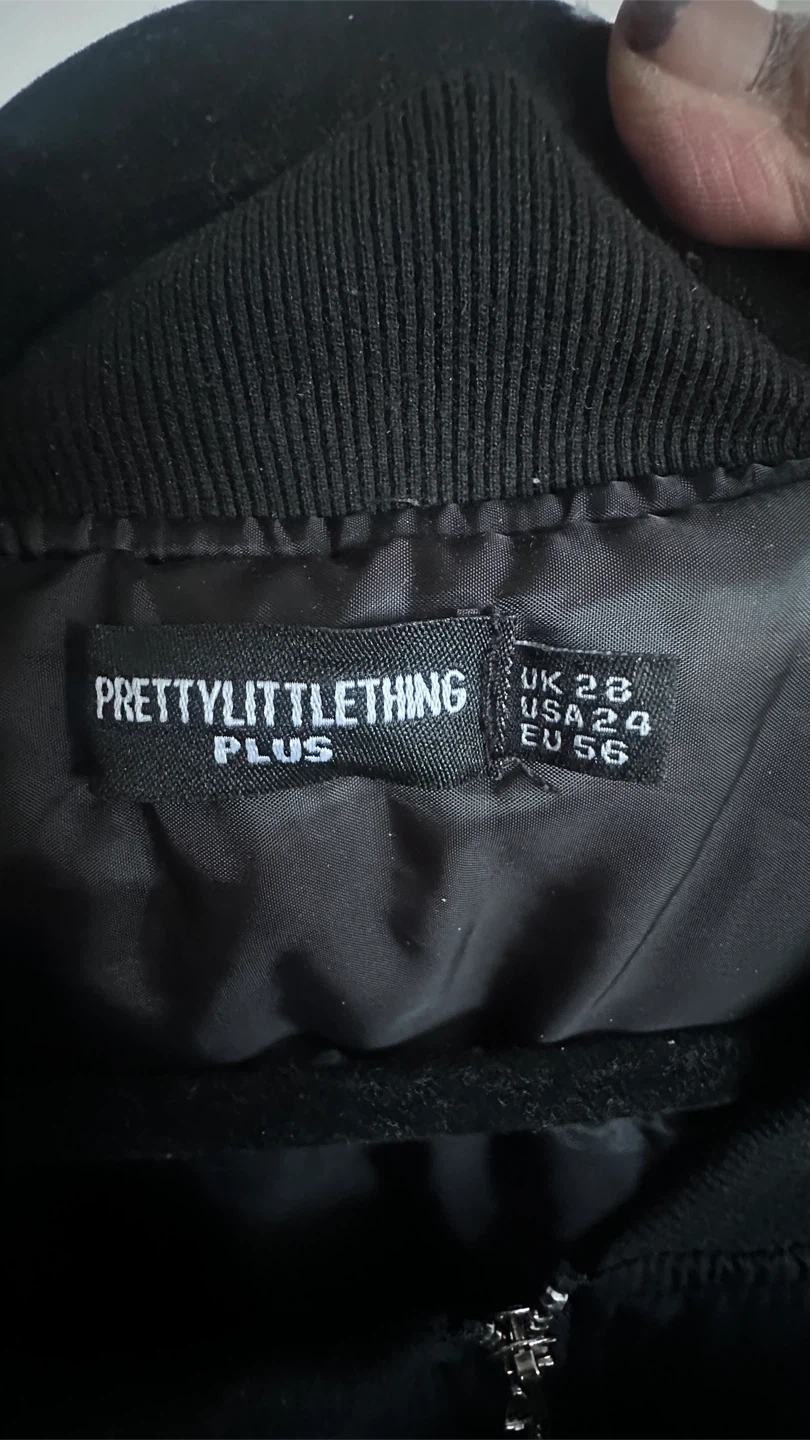 This black oversized bomber jacket is from PrettyLittleThing Plus. It's a size EU 56 / UK 28 / USA 24. It has a zip-up front and two faux chest pockets and two button up pockets and one small zipper slot on the arm.