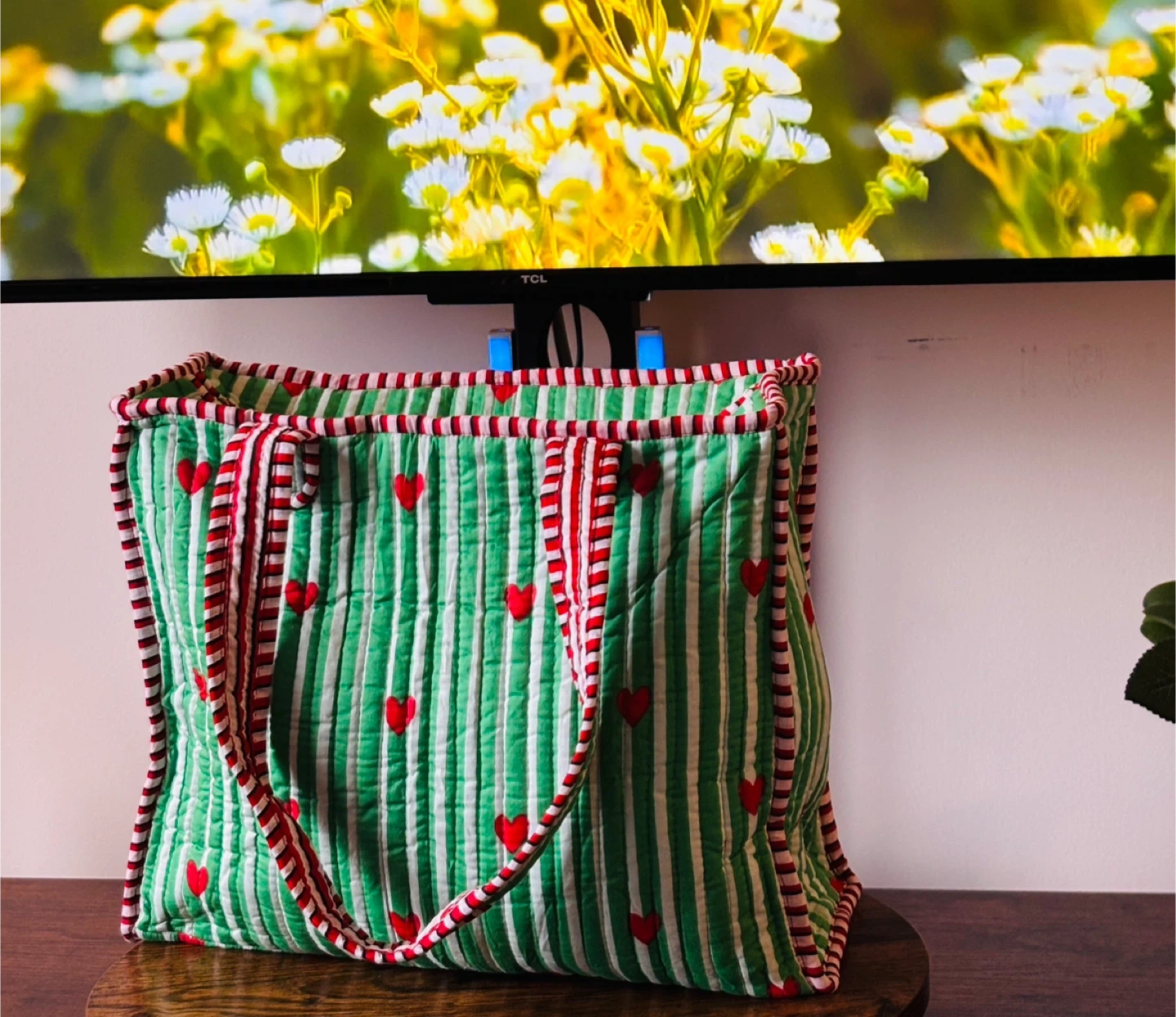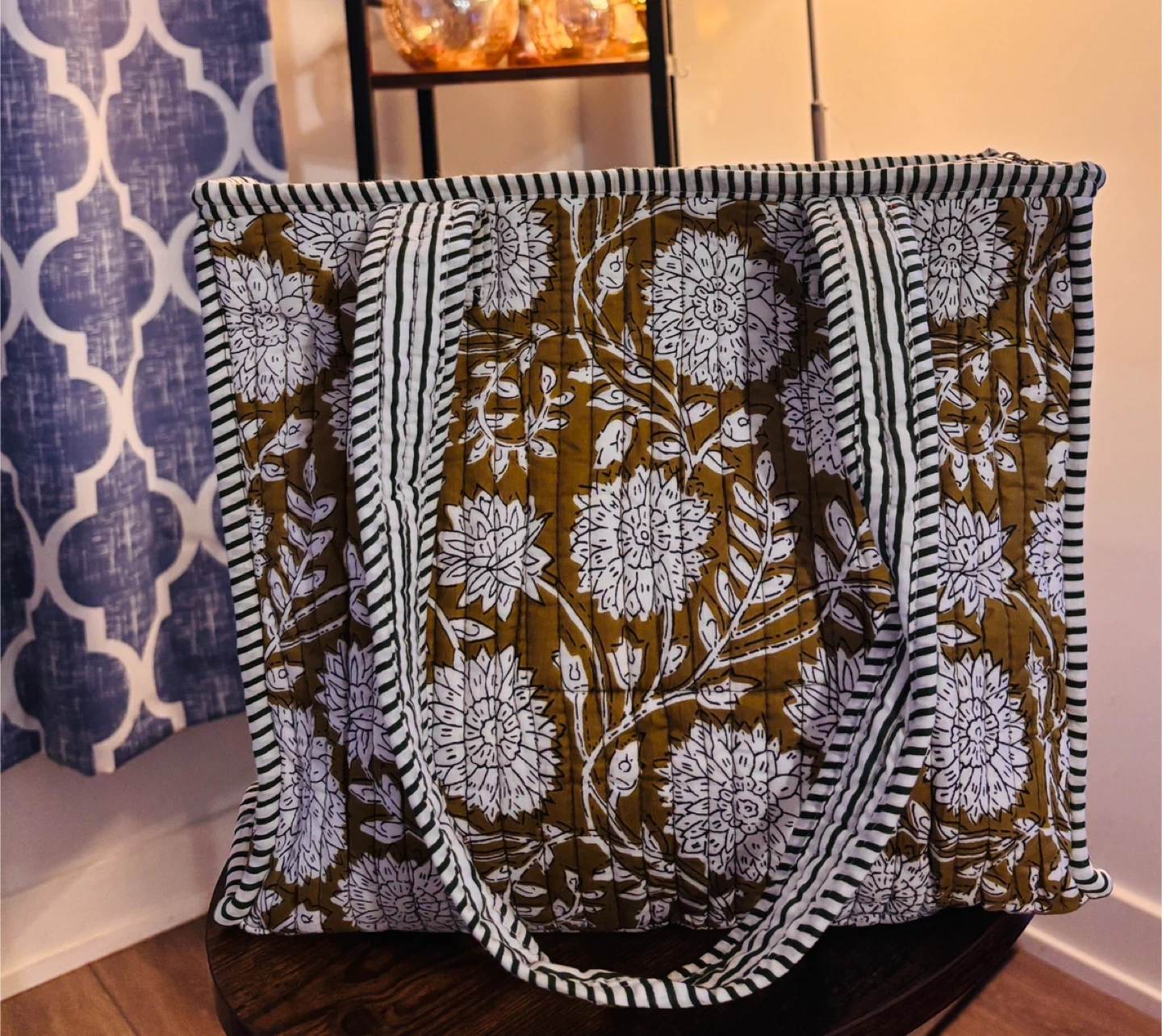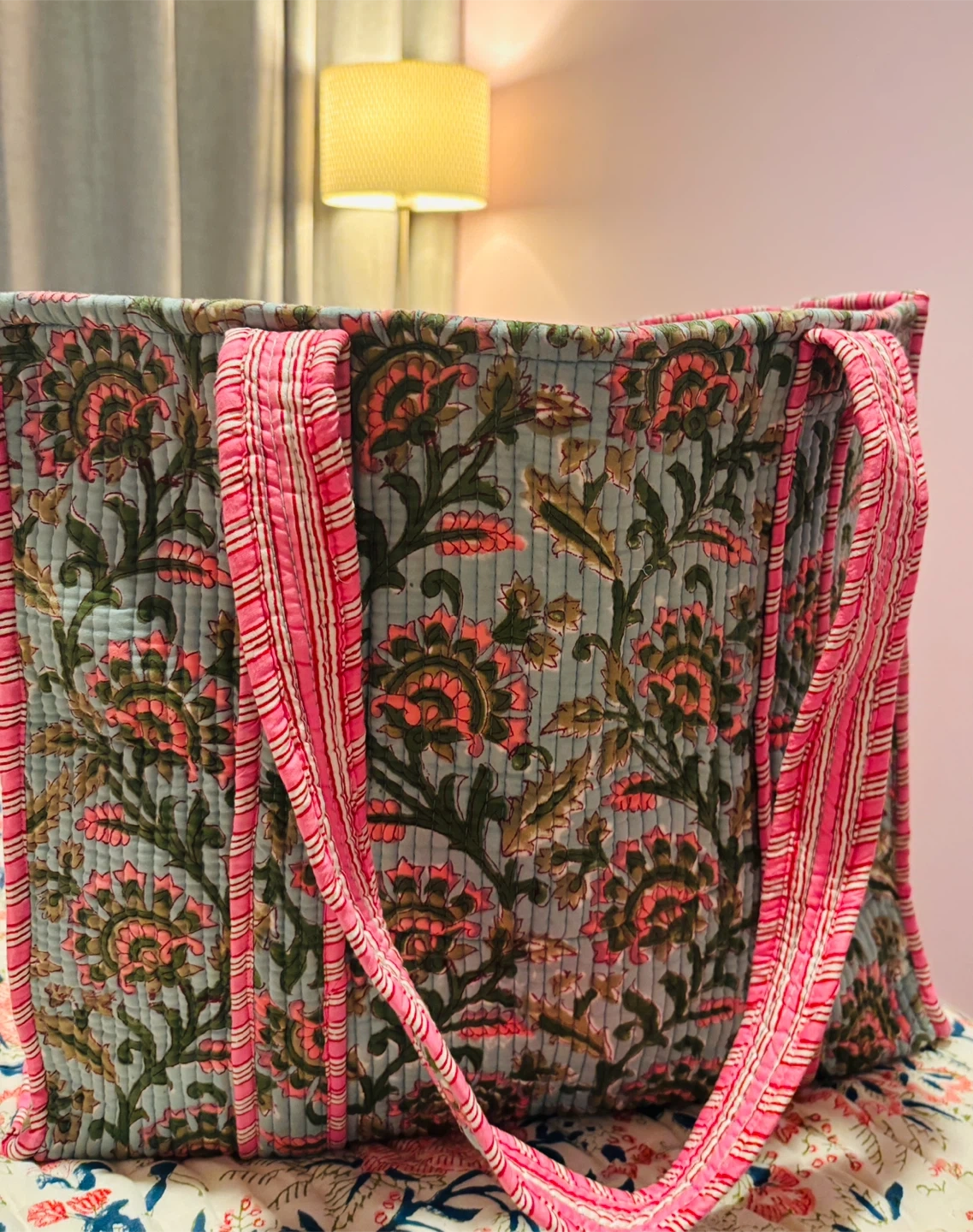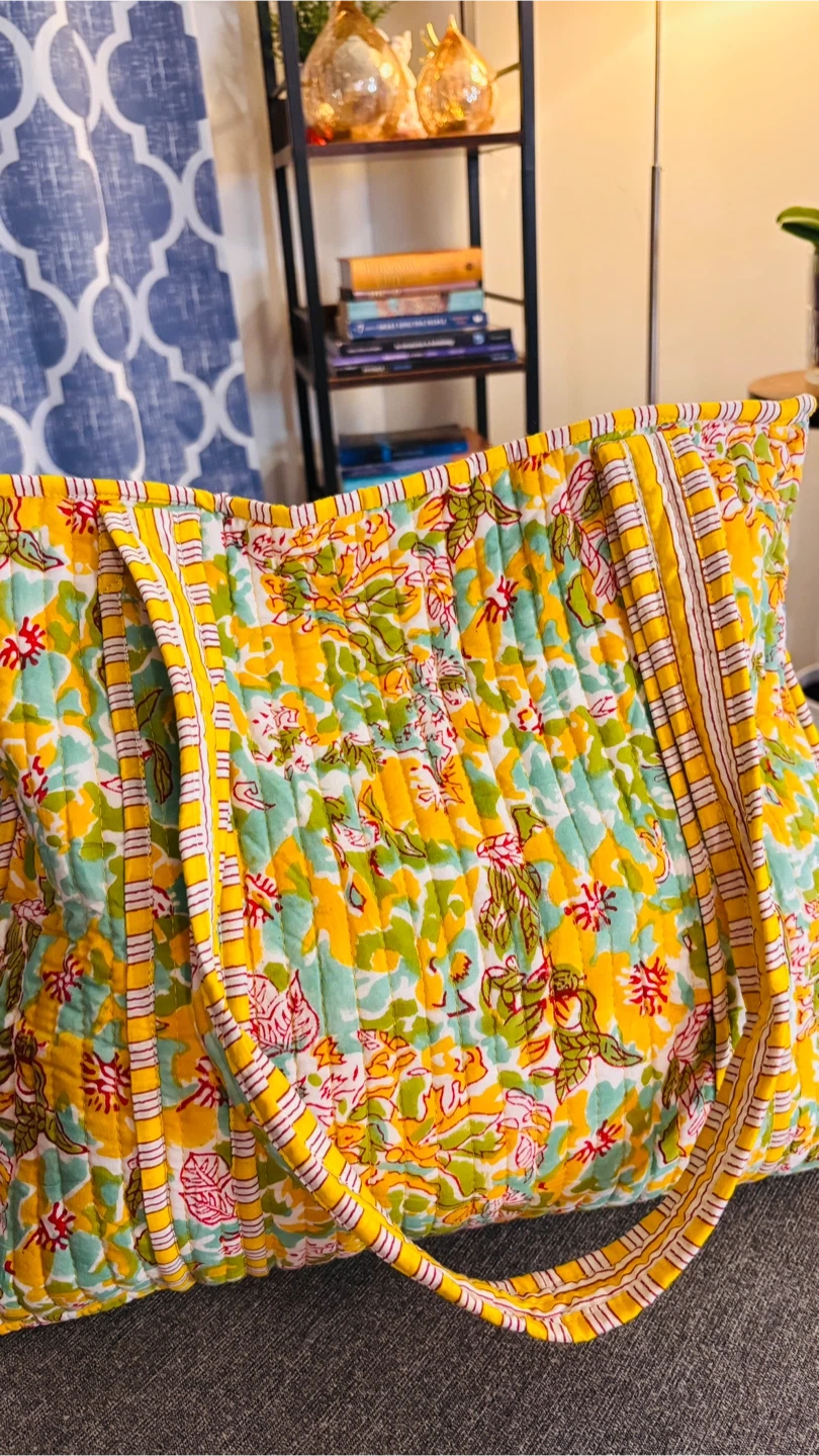 Quilted tote bag featuring a playful strawberry print and many more vibrant colours. It's perfect for carrying your essentials. Fabric material. 100 cotton , very soft to touch with inner pocket and zipper closure.