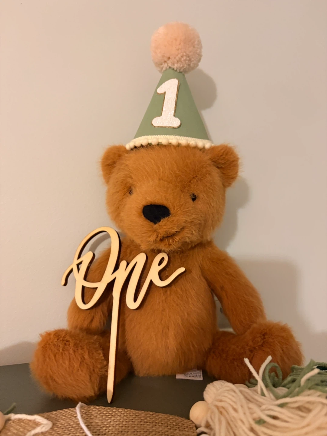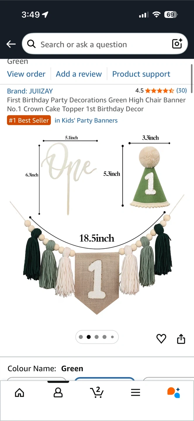 This set includes a green high chair banner and a 'One' cake topper. The banner is made of burlap with green and cream tassels. It's in perfect condition, zero wear. Bought from Amazon for $30 plus tax.