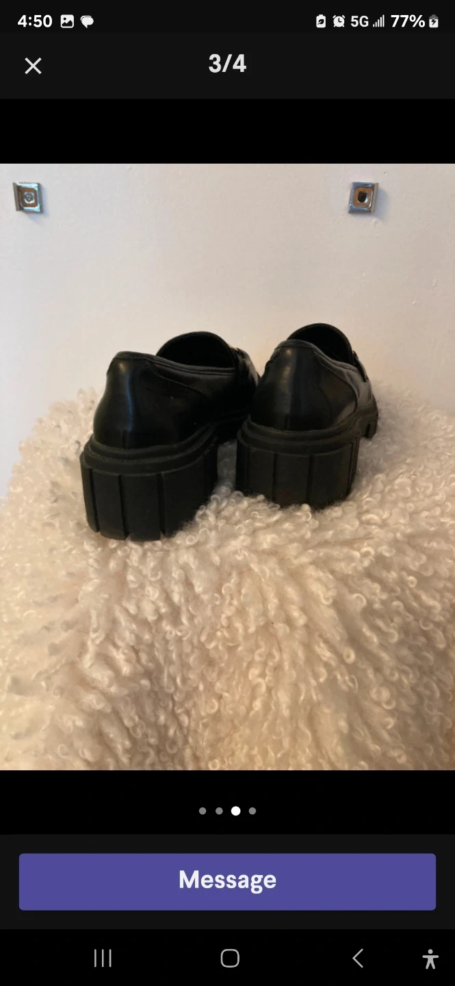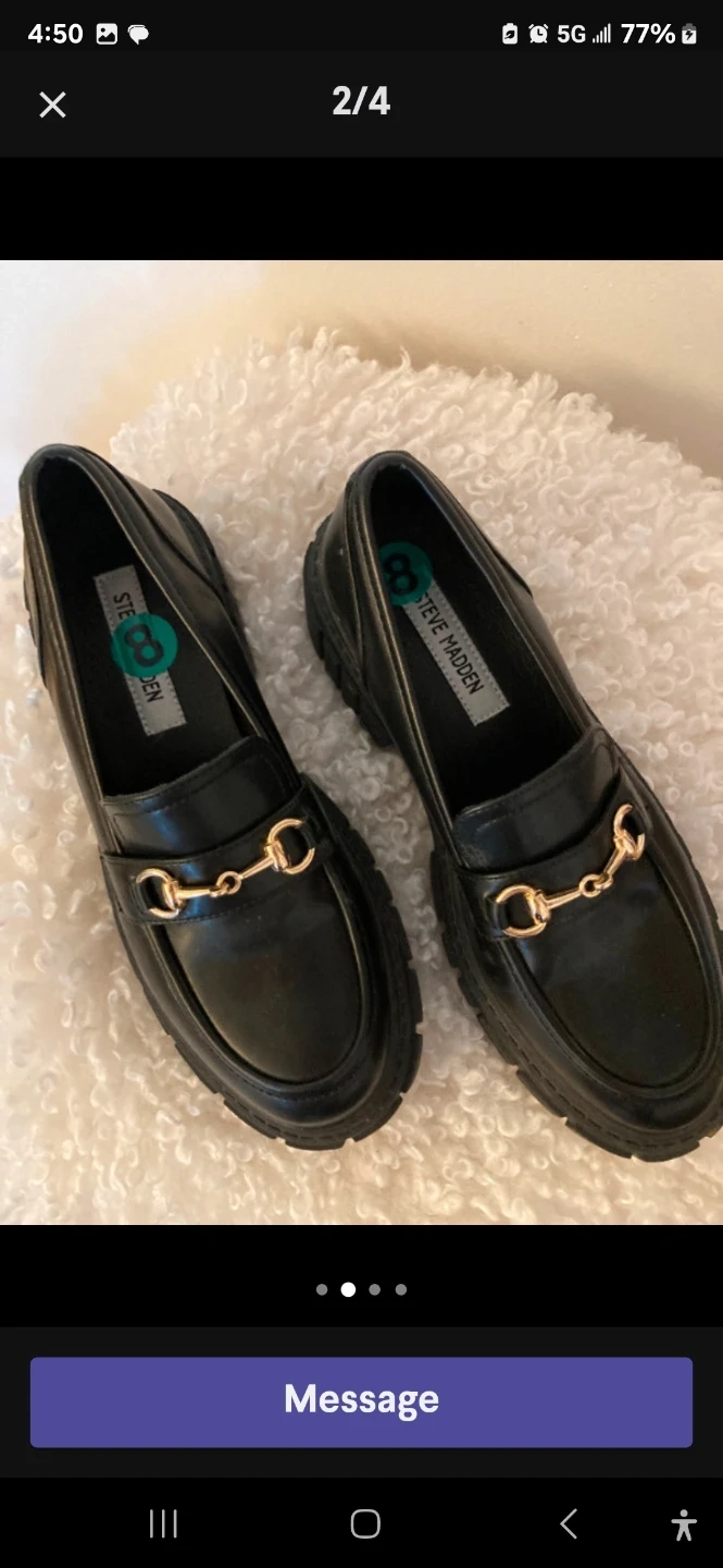These are black Steve Madden loafers with a chunky sole and gold hardware. They're made of leather. Good for casual wear or dressing up an outfit!