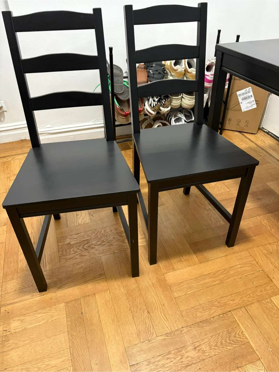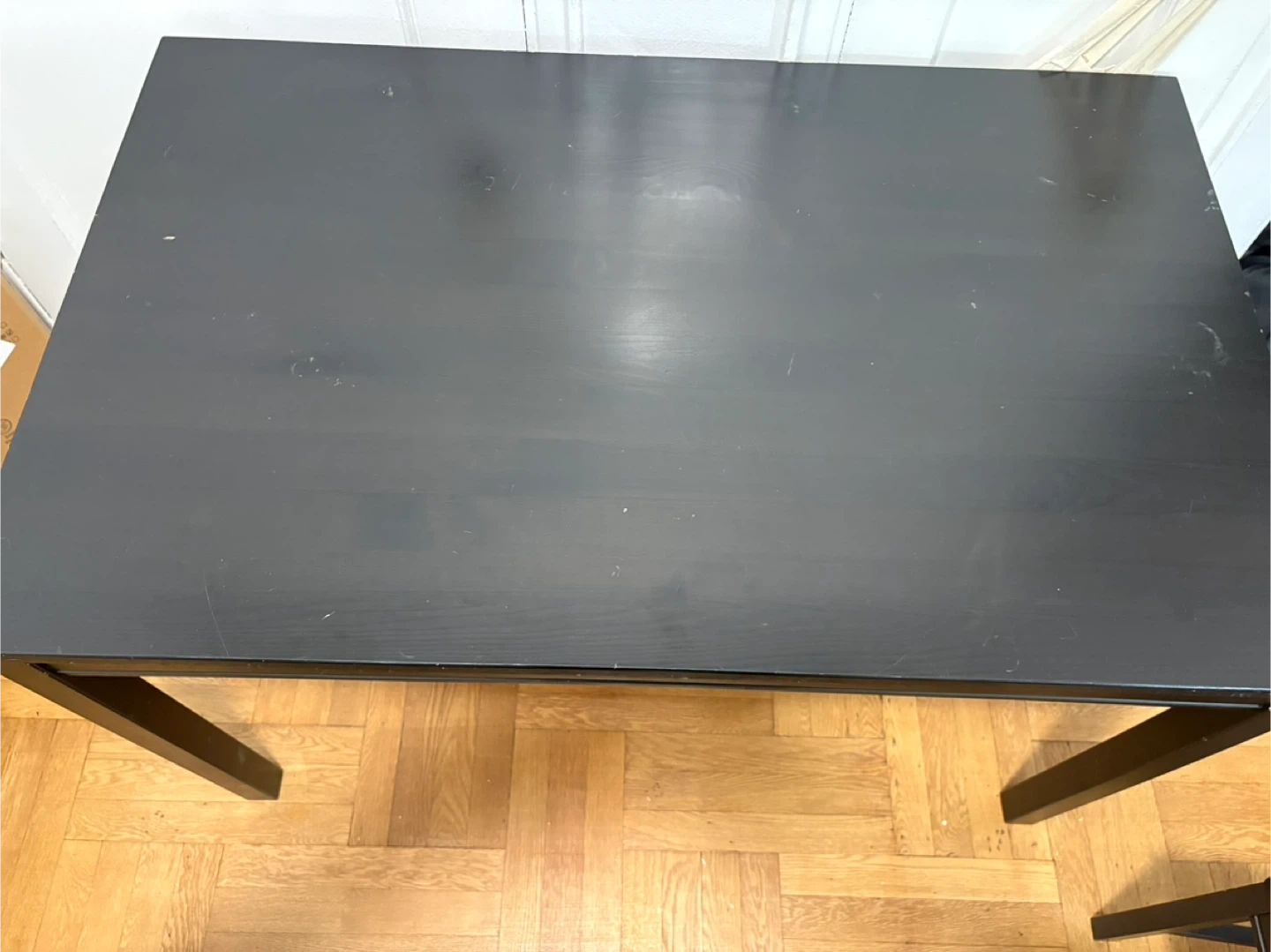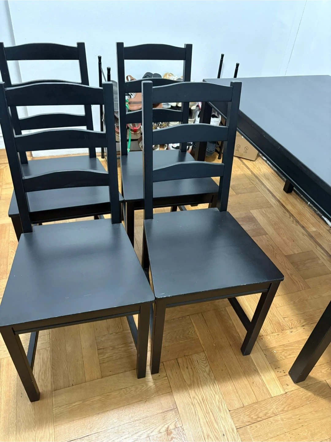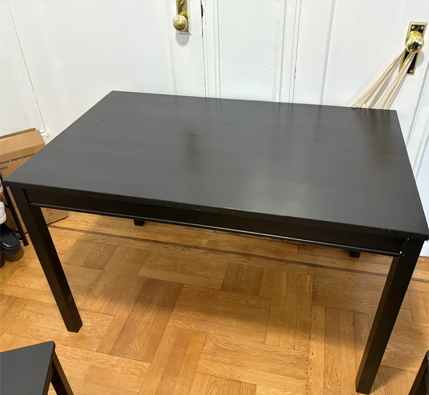 IKEA Hagernas 4 seat dining table set. 2 years old gently used. This is sturdy and can easily be broken down and reassembled. Sadly it will not fit in my new dining space so it has to go. Available ASAP!