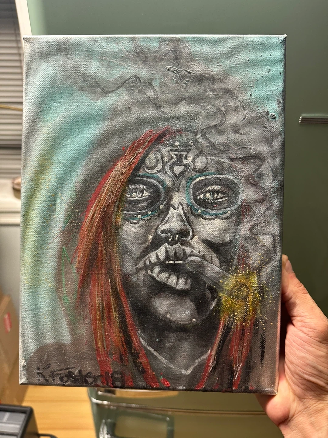 This is an original acrylic painting on canvas by artist Ken Foster 2018. Sugar skull girl smoking a cigarette, surrounded by smoke. Canvas dimensions are 8x10 inches.