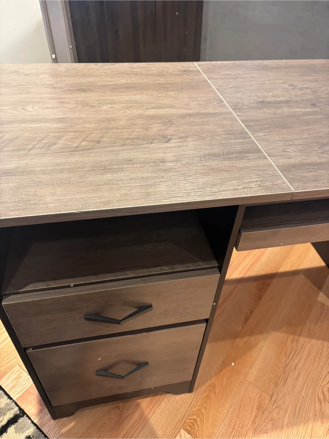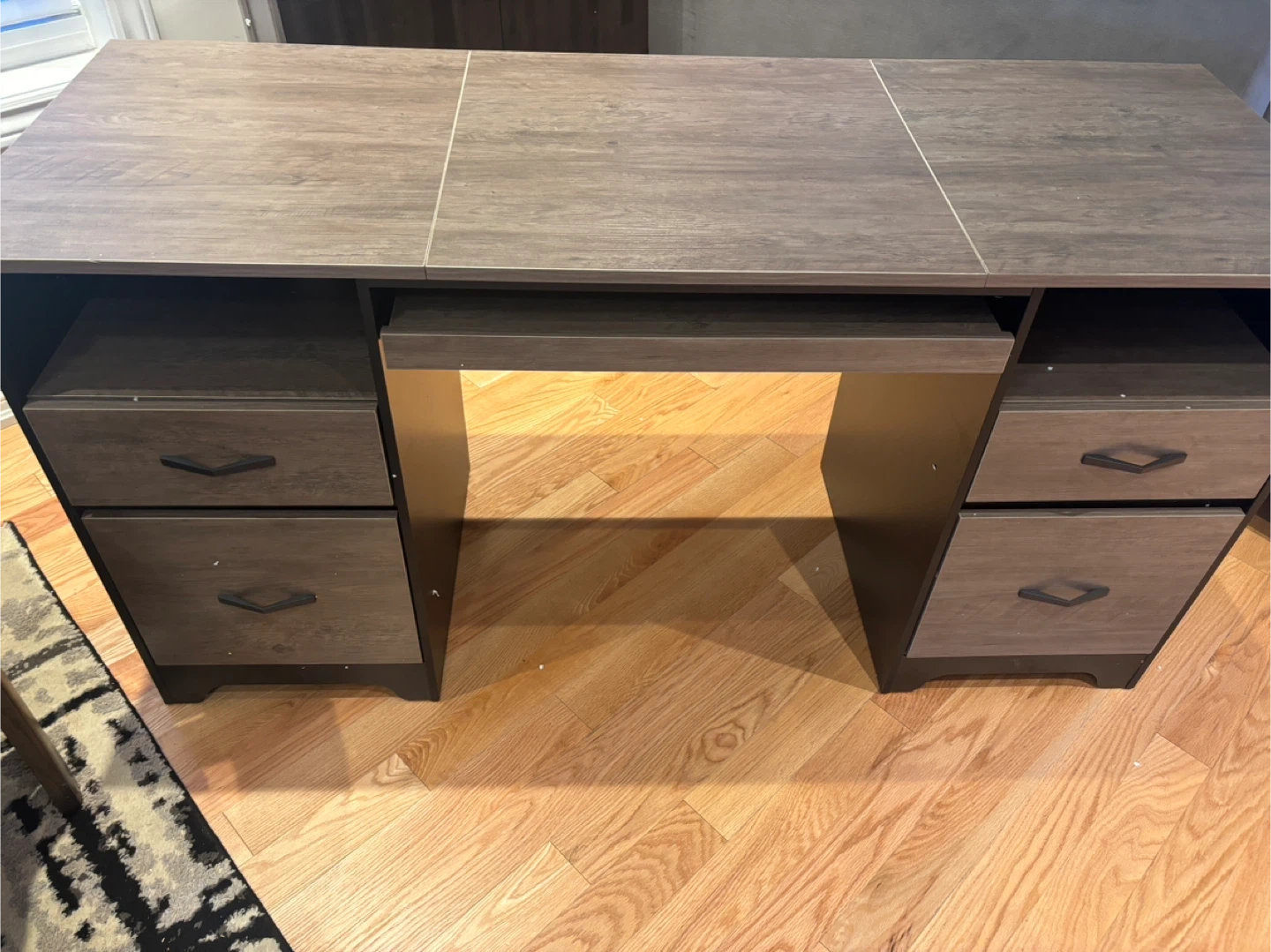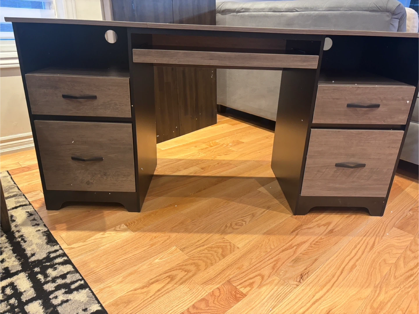 Dark wood computer desk. Includes a pull-out keyboard tray.Features four drawers for storage. Manufactured wood material.