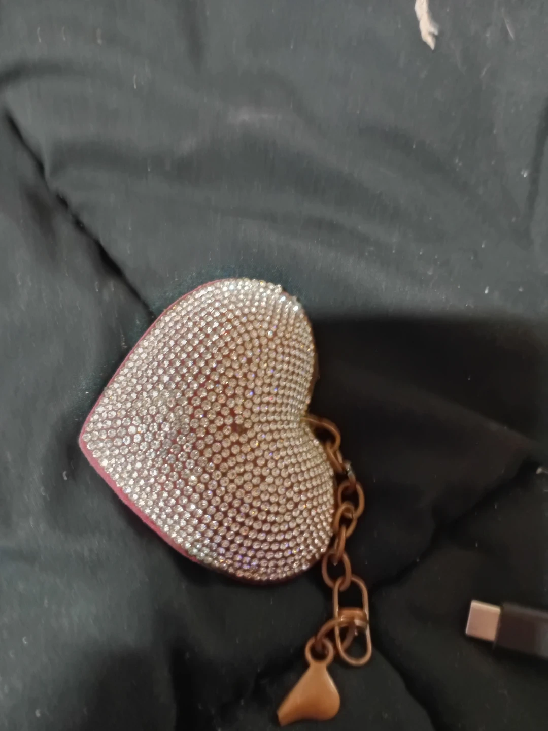 This keychain features a heart-shaped charm covered in sparkling rhinestones. It's attached to a sturdy chain with a small charm. It's a fun accessory for your keys or bag!