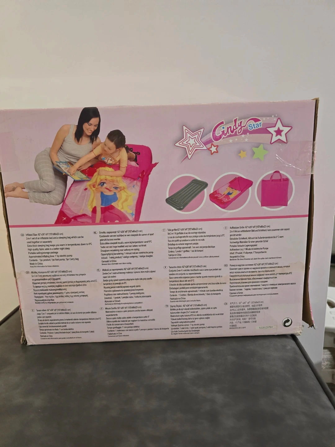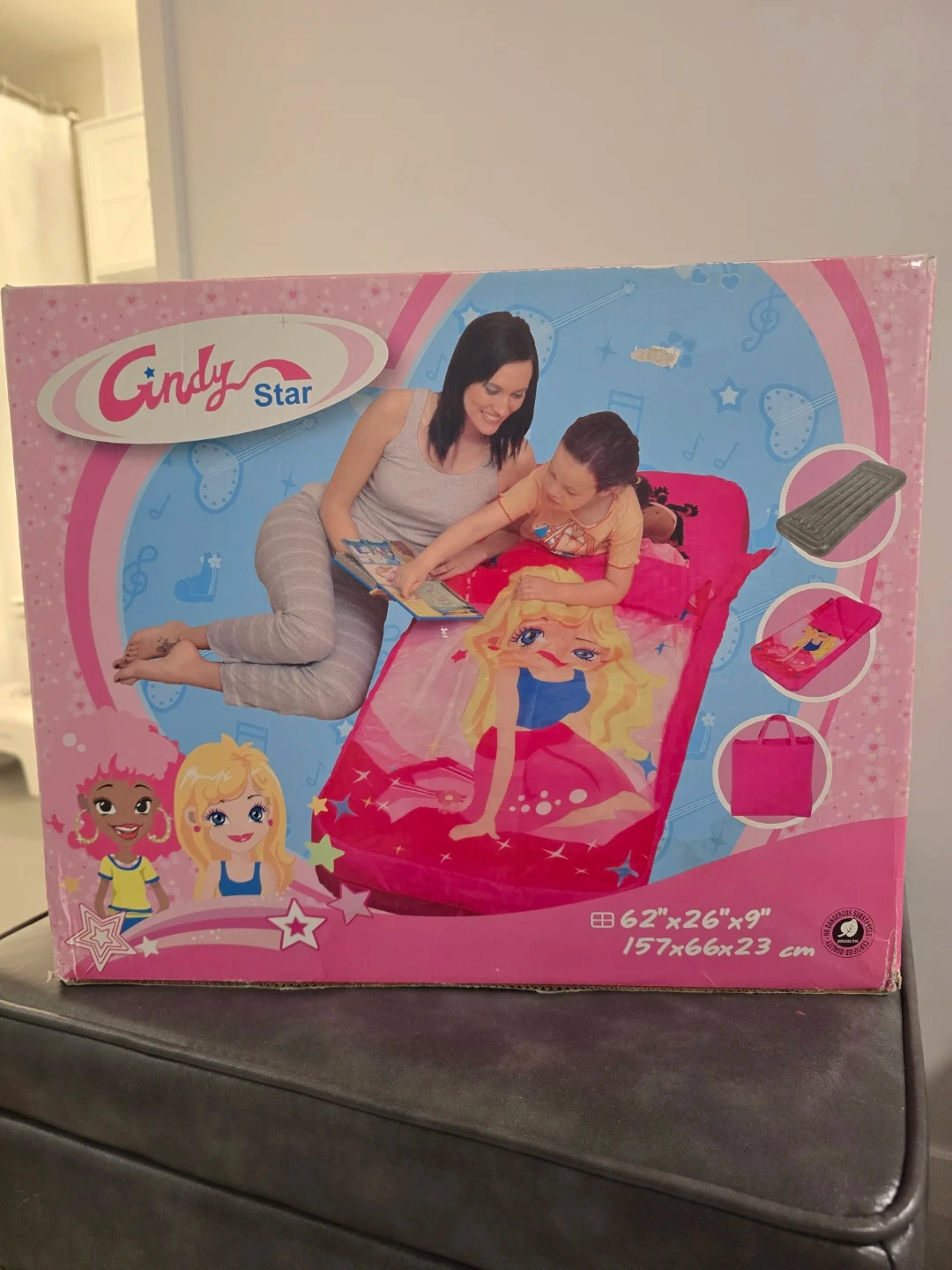 This is a Cindy Star inflatable toddler bed. It's perfect for sleepovers or travel. Comes with a carry bag and a small pump.