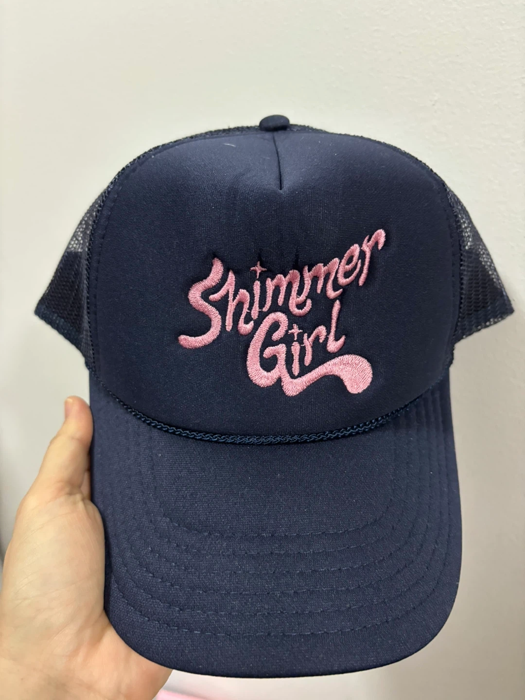 Navy blue trucker hat with pink embroidery that reads "Shimmer Girl". It's a classic mesh back style. This hat's adjustable strap makes for a comfortable fit.