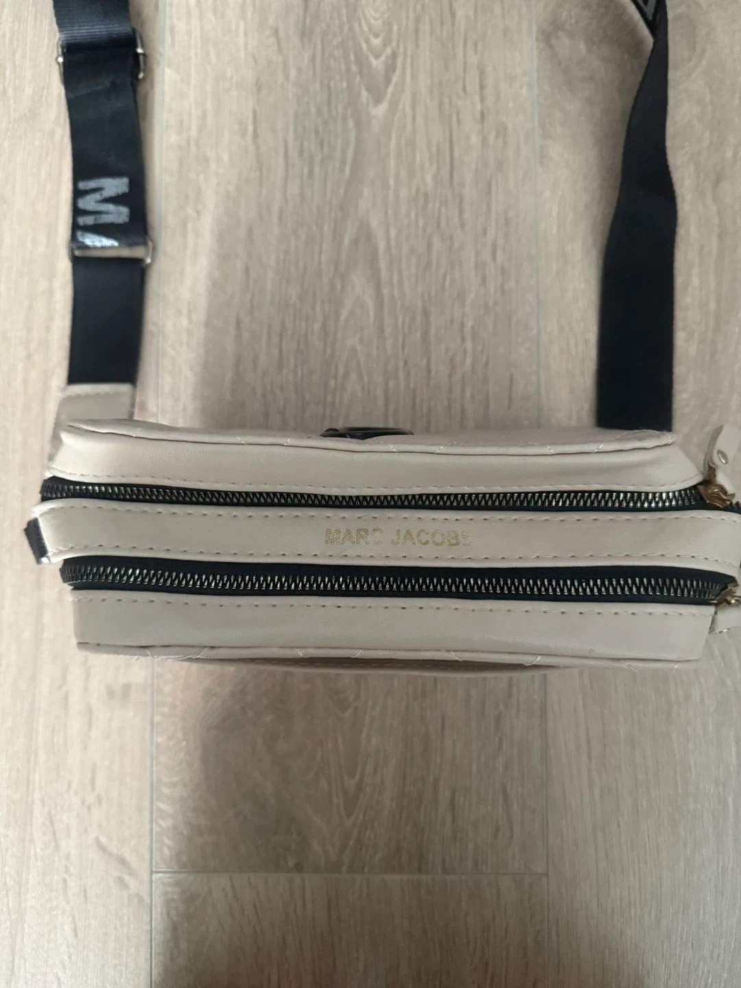 This is a beige Marc Jacobs The Snapshot Bag. It features a quilted design and a black strap with the brand name printed on it. The bag has a front pocket and a main zippered compartment. The retail price goes around 430-460 CAD so i kept the price reasonable since its worn before. Im open for reasonable offers.