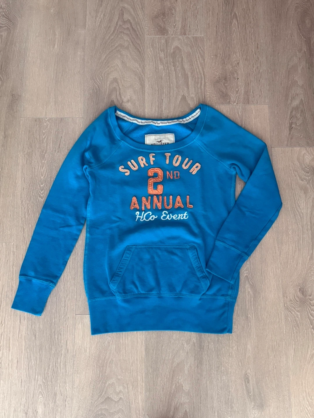 Blue Vintage Hollister sweatshirt with 2000s classic graphic. It's a size womens medium and made of a soft cotton blend. This crewneck style features a kangaroo pocket. Perfect for casual wear! Only worn a few times, Im selling since Im a student! I do discounts on bundles!!