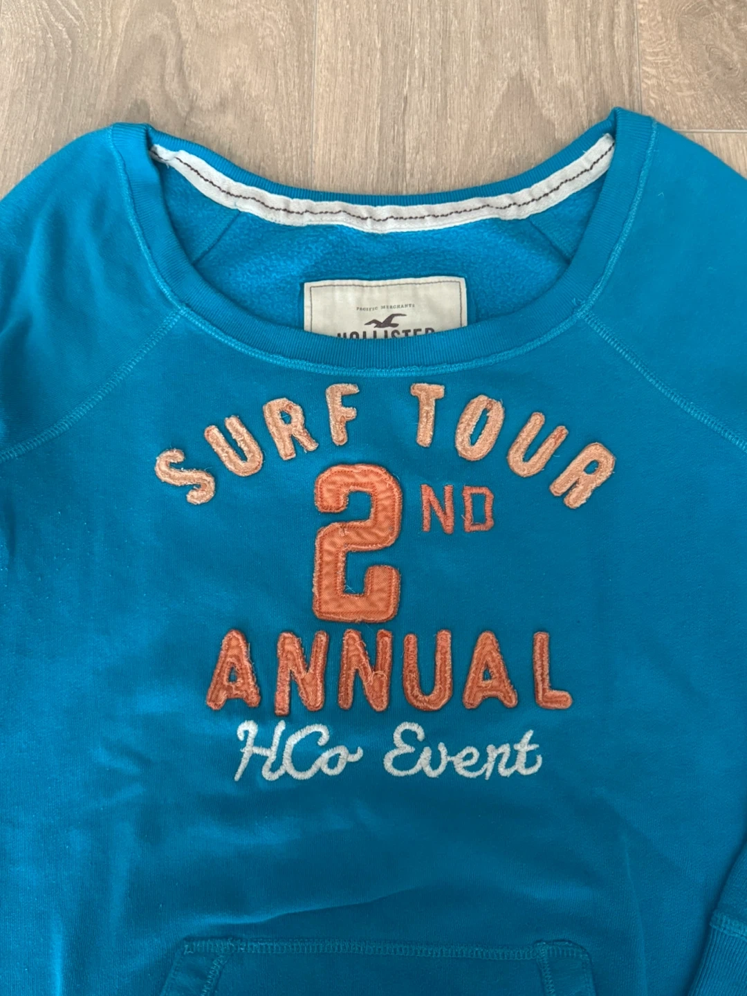 Blue Vintage Hollister sweatshirt with 2000s classic graphic. It's a size womens medium and made of a soft cotton blend. This crewneck style features a kangaroo pocket. Perfect for casual wear! Only worn a few times, Im selling since Im a student! I do discounts on bundles!!