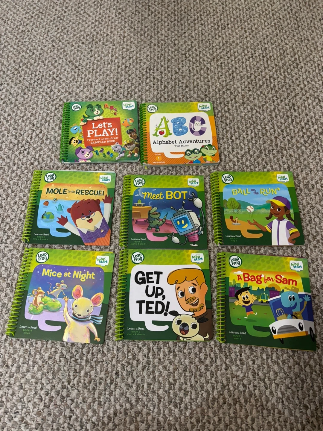 This set includes 7 LeapFrog Learn to Read books. Titles are "Let's Play!", "Alphabet Adventures with Music", "Mole to the Rescue!", "Meet BOT", "Ball on the Run", "Mice at Night", and "A Bag for Sam". These books cover various reading skills like long and short vowels.