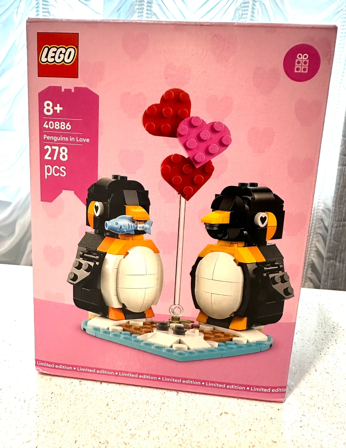 This is the LEGO 40886 "Penguins in Love" set. It contains 278 pieces. This limited edition set is recommended for ages 8 and up.