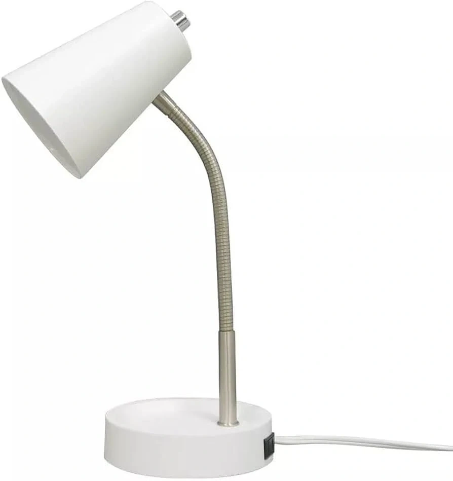 White desk lamp with a flexible gooseneck for adjustable lighting. Features a sturdy base with an on/off switch. Metal and plastic construction.