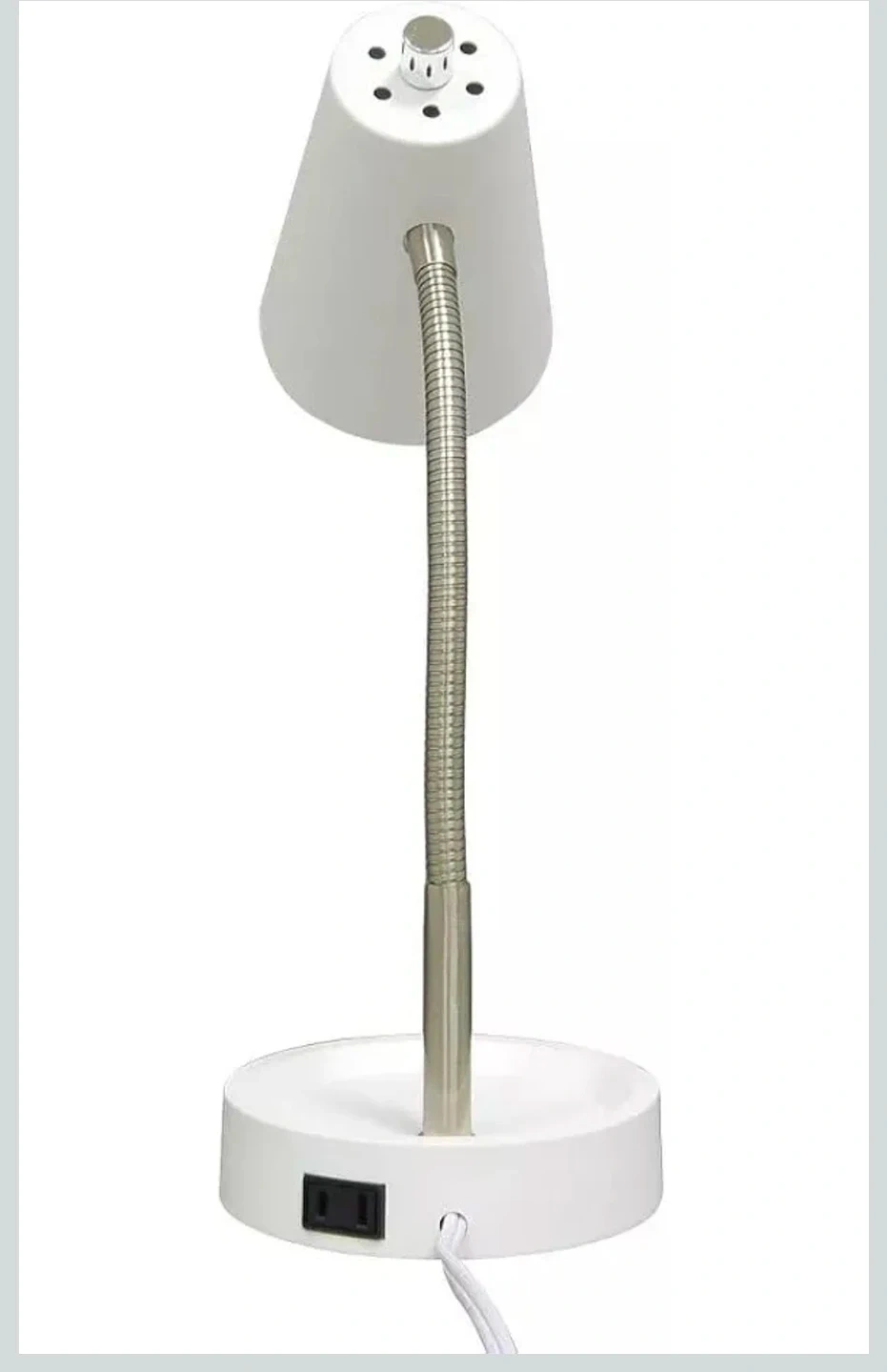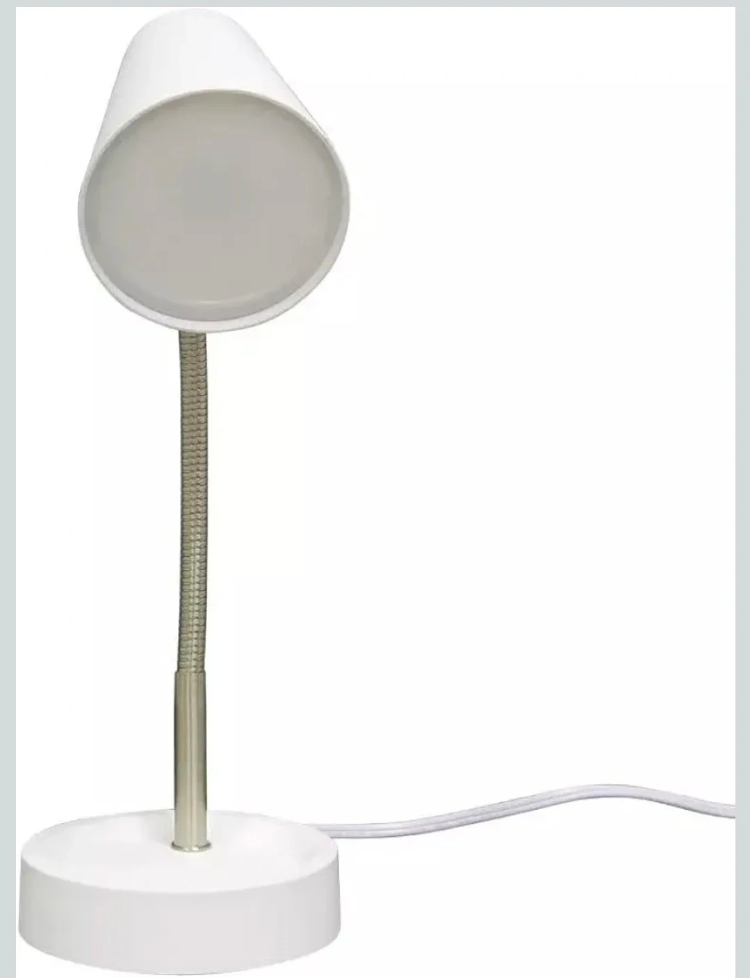 White desk lamp with a flexible gooseneck for adjustable lighting. Features a sturdy base with an on/off switch. Metal and plastic construction.