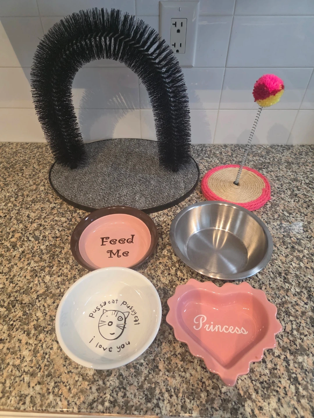 This set includes a cat grooming arch for brushing and four cat feeding bowls. One bowl says 'Feed Me,' another says 'Princess,' and one has a cute cat drawing with 'pussy cat pussy cat I love you.' The grooming arch has a sturdy base. My adult cat never showed interest