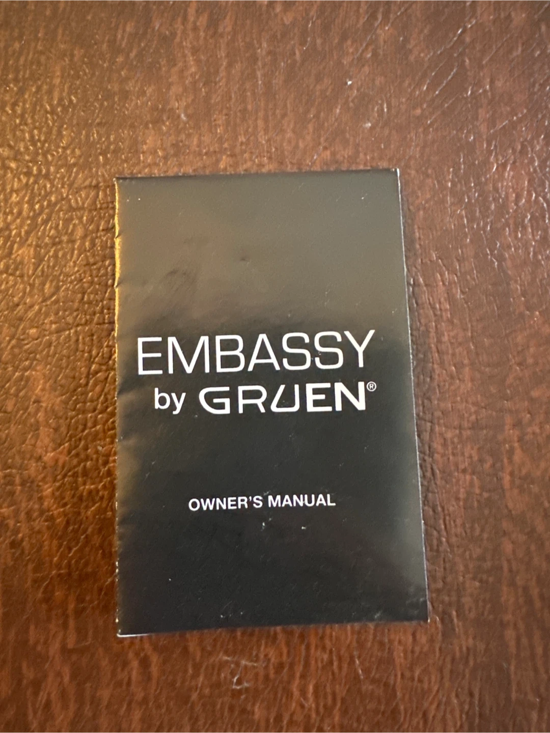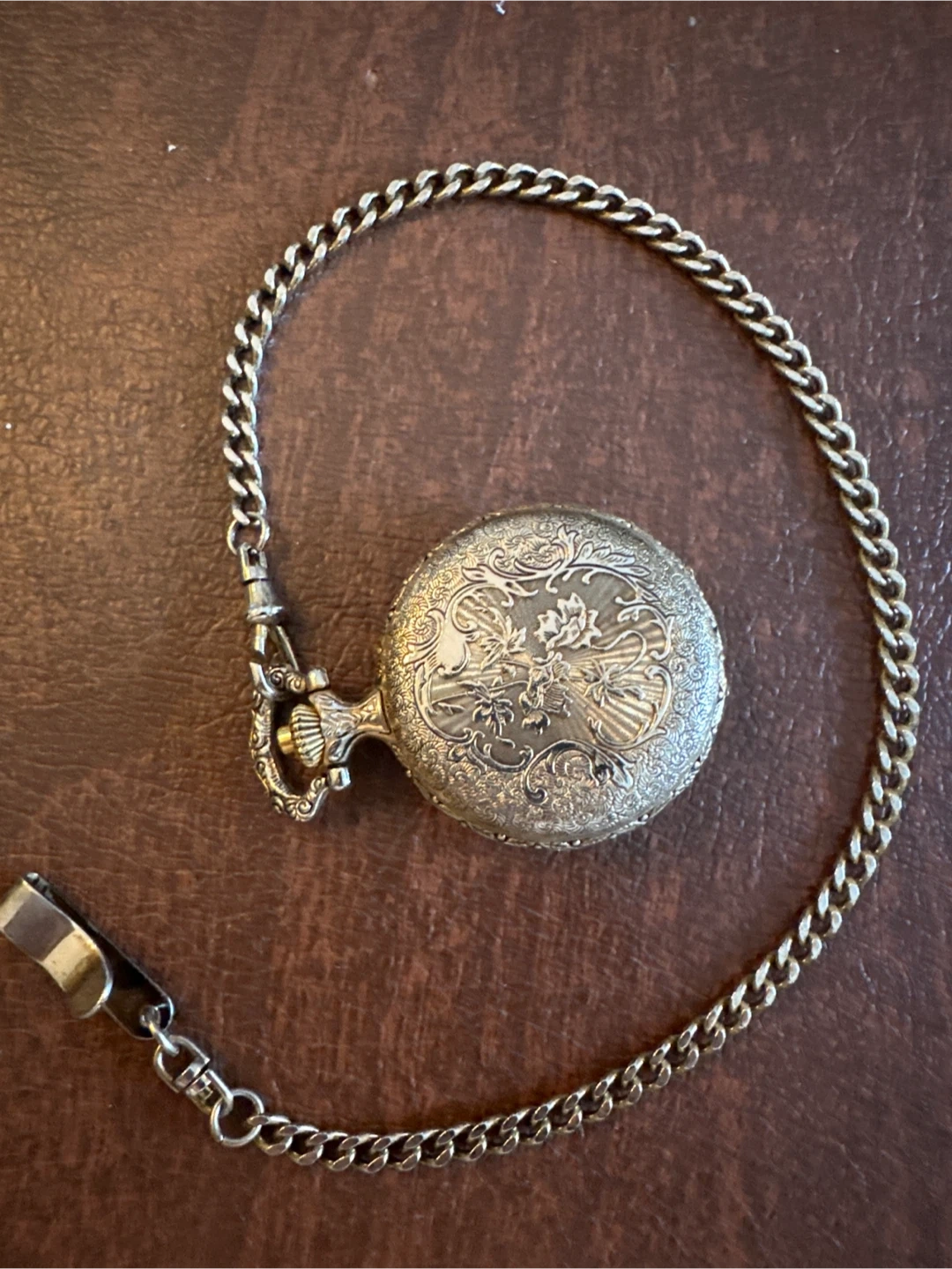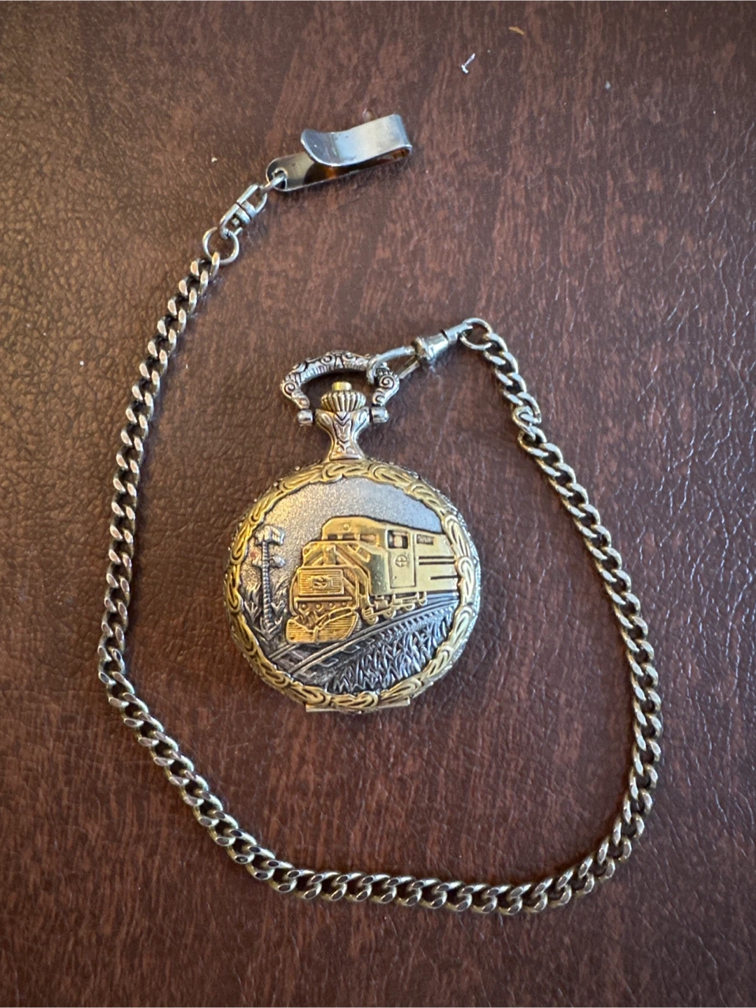 This Embassy by Gruen pocket watch features a classic design with a train motif on the cover. It's a quartz movement watch with a matching chain. The owner's manual is included.
