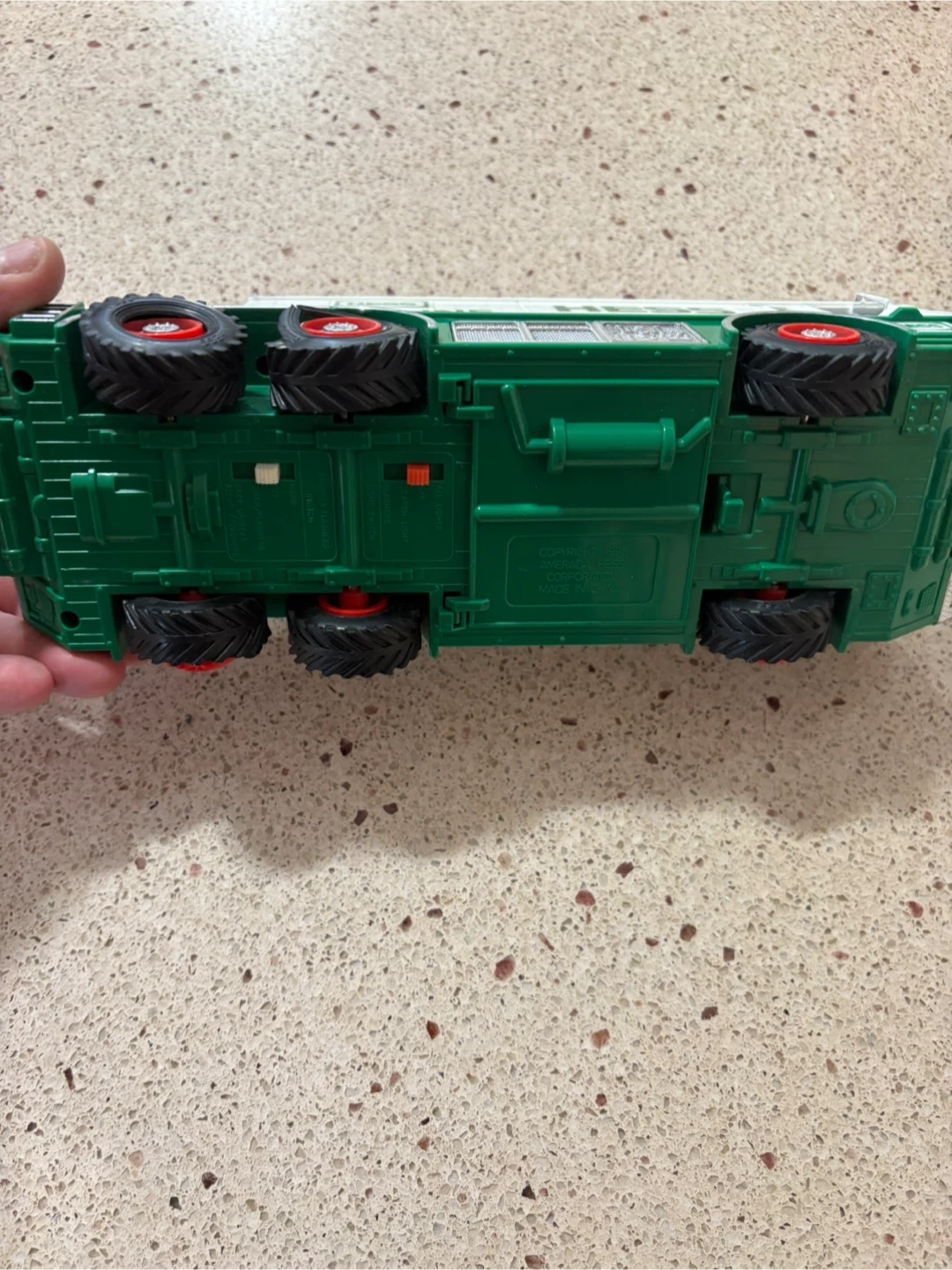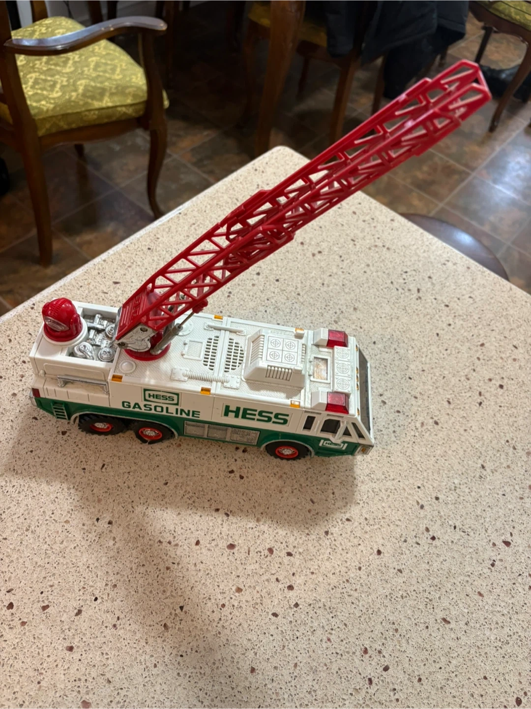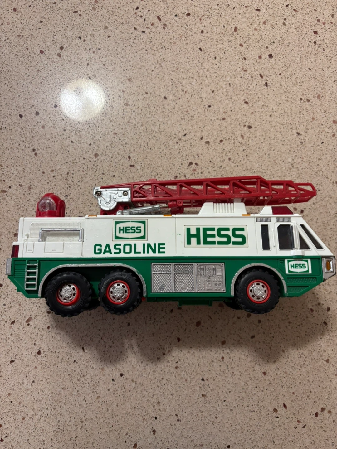 This is a Hess toy fire truck with a working ladder. It's white and green with red accents. This classic Hess toy is great for collectors or kids who love emergency vehicles! Tires are not in the best shape.