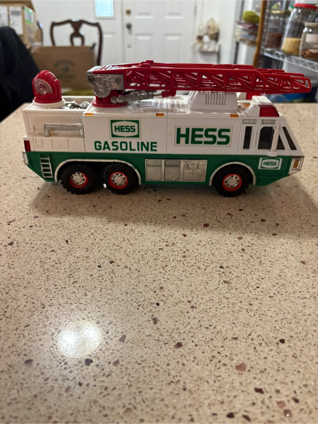 This is a Hess toy fire truck with a working ladder. It's white and green with red accents. This classic Hess toy is great for collectors or kids who love emergency vehicles! Tires are not in the best shape.